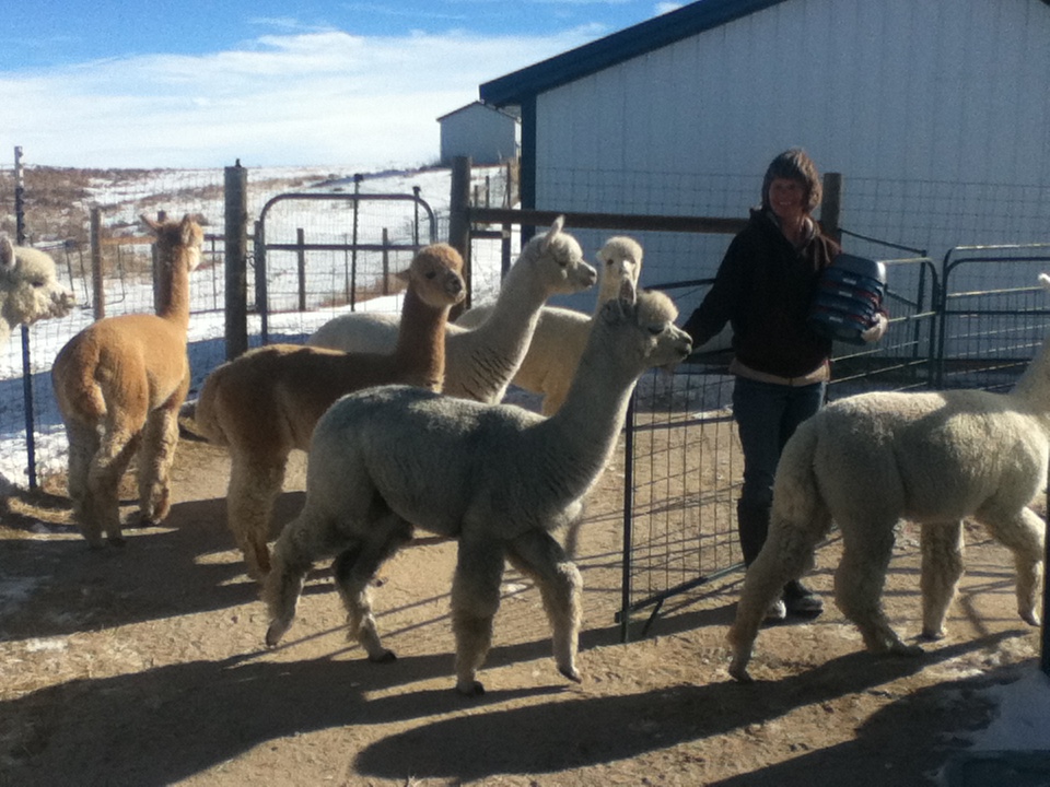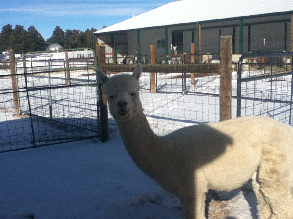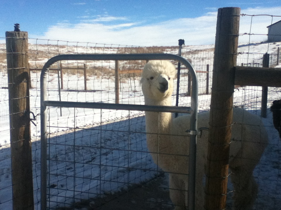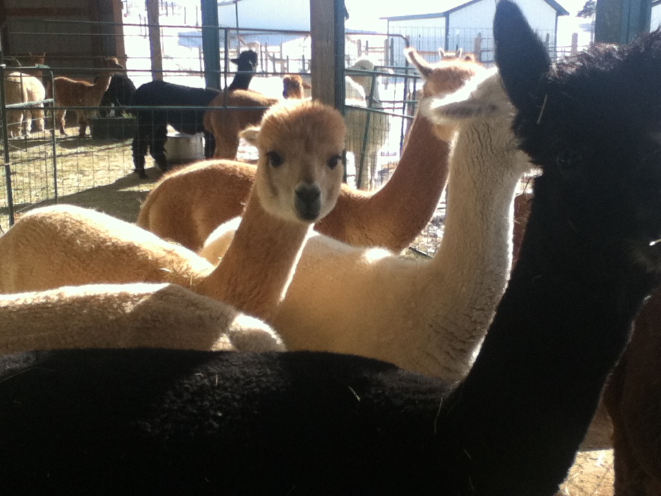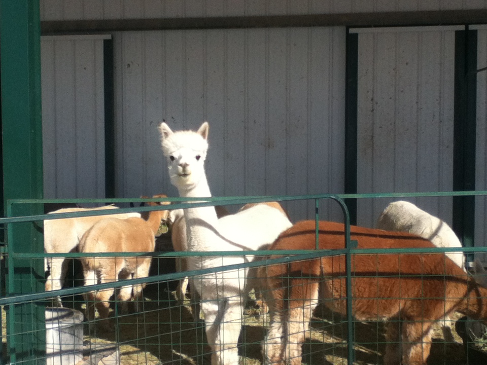 We went to visit our friends at Falkor Ranch who have seventy five alpacas. It was a bitter cold morning but we trudged out to their farm for our visit. We want to see as many farms as we can before we get our own. Two beautiful white dogs came to greet us, tails wagging. Their parents were surprised as the dogs are often aloof. They must have sensed our childlike wonder and mistook us for seven year olds. We snuggled with them before heading over to the alpacas.