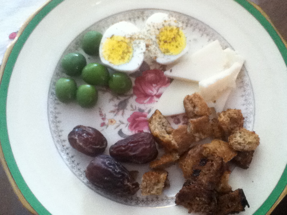 I prepare “peasant plates” of what my family calls mish mosh.  Romantic term; probably won’t make it into any of the books I read.  It is a bit of heavenly cheese, crackers, homemade bread, olives, homemade pickles, salad, leftovers, whatever inspires me.  Some dates, grapes, or some type of fruit.  I get bored very, very easily and one bowl meals make me wander off and forget to finish my food so the variety pleases me.
