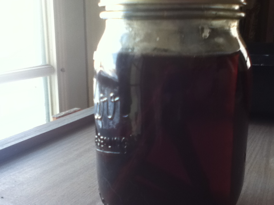 Fill jar with vodka, rum, brandy, or apple cider vinegar if you are adverse to alcohol (the alcohol works the fastest though).  Shake daily and keep in window for a week.  Place in cupboard.  After four weeks, strain.  It is ready after a week, however.  Just dip your teaspoon in there.  You can put your teaspoon of ‘maybe not the yummiest concoction you ever made’ into a tablespoon of orange juice to help it go down! This works as cold medicine as well.  Take 1 ts as needed.  You cannot overdose!