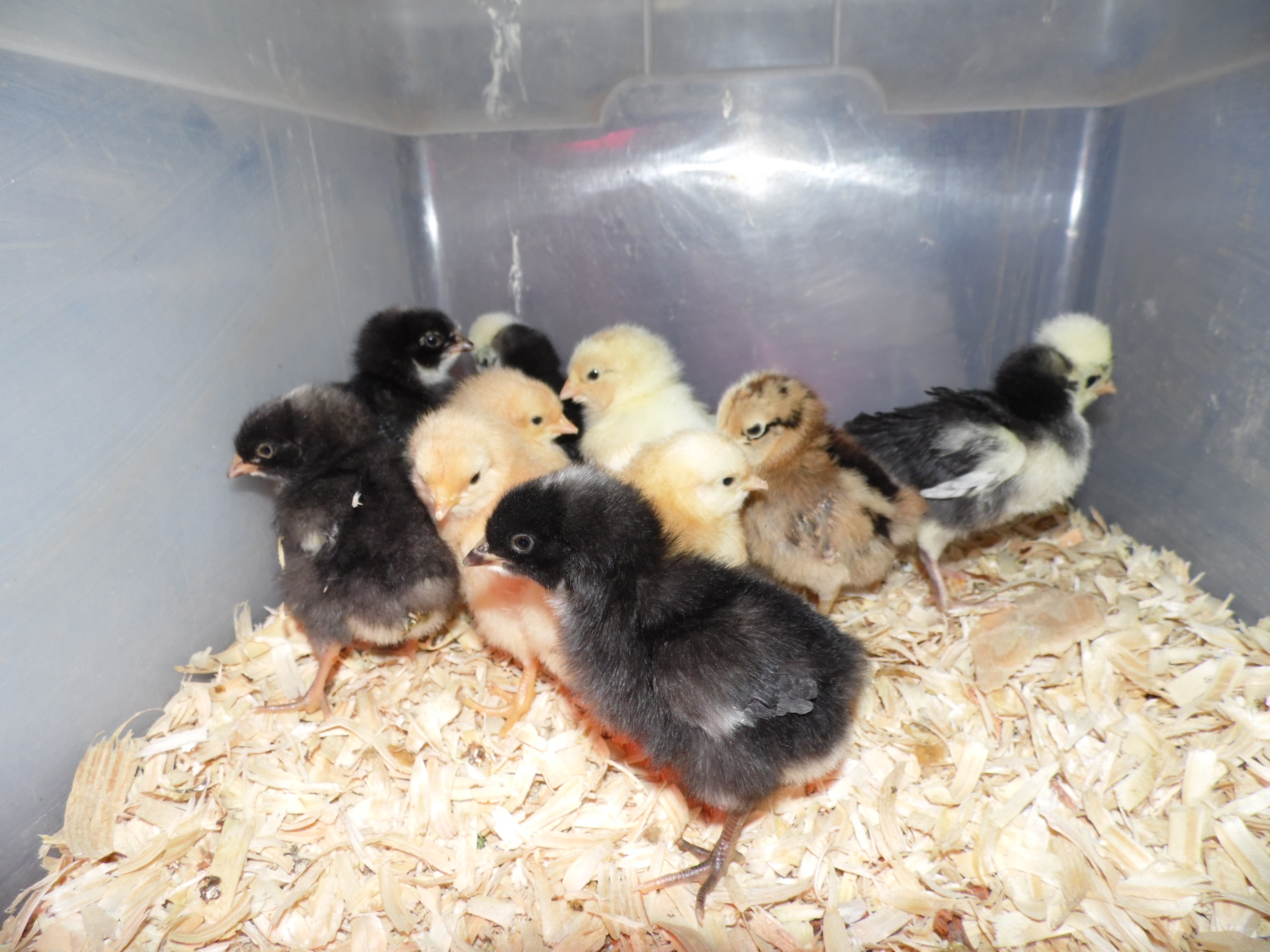 I carried the box of babies, chirping up a storm, out the back door to the garage. Apparently eleven chickens and a red light were a bit too much in the nursery for a new mom so Emily banished them to the garage! So out we traipsed to the garage where the set up and Aretha and Ginger had been moved. The noise raised the attention of Daffodil the grown chicken. She pulled up tall and started attacking my boot. Seems one of the babies was talking smack. Safely in the garage, I dipped each tiny beak into the water and let them have a drink. They settled in immediately. The sheer horror and confusion on Aretha’s face was more than amusing as she was ten days old when the chicks came and had clearly made this her domain. While Ginger hid in the corner, Aretha pecked at their little toes and ran right over the top of them. I held my breath and tried to calm her but I knew she just had to get used to the new infants. Which she quickly did. Lesson one: Don’t put chicks around the big chickies yet.