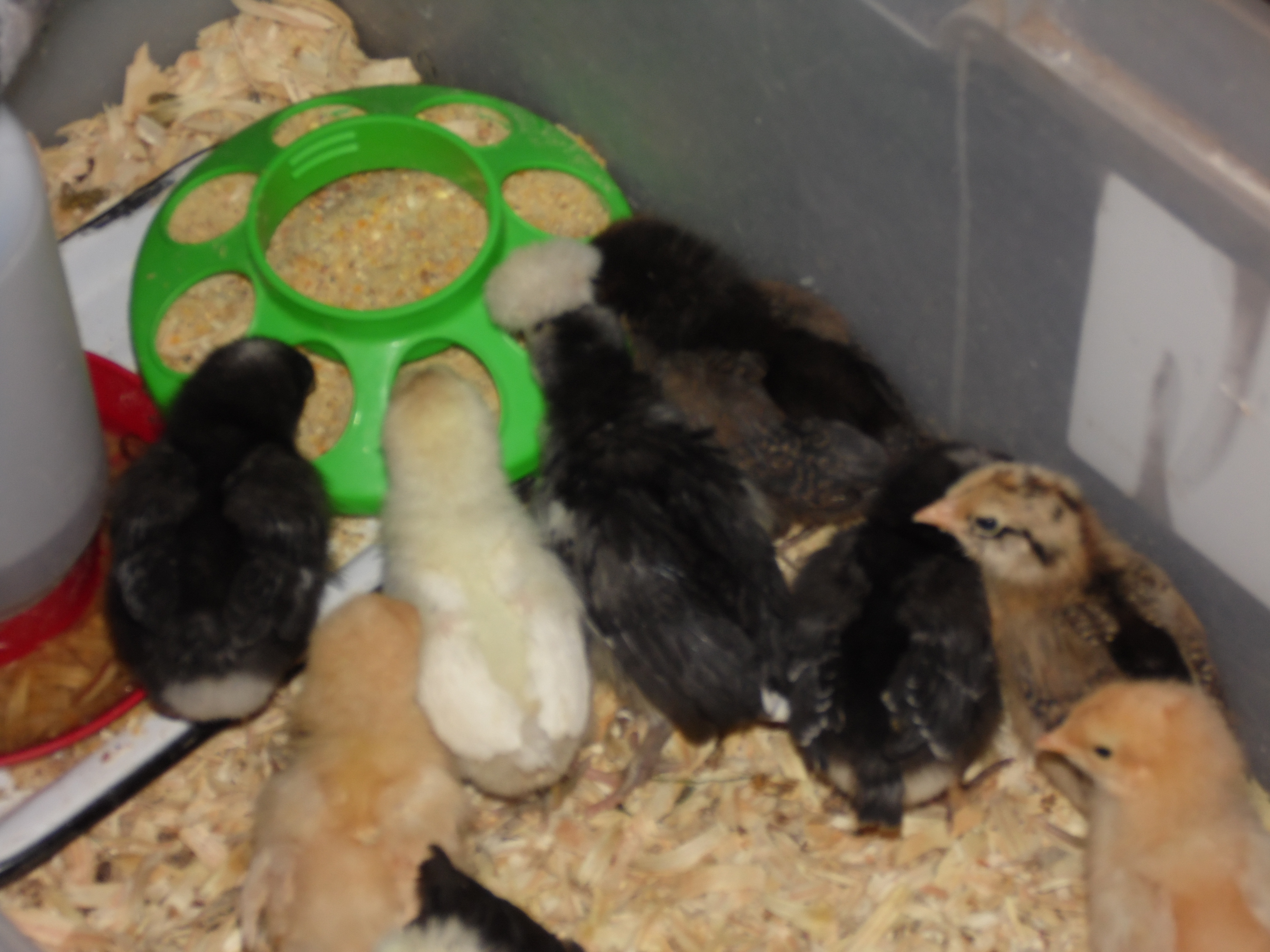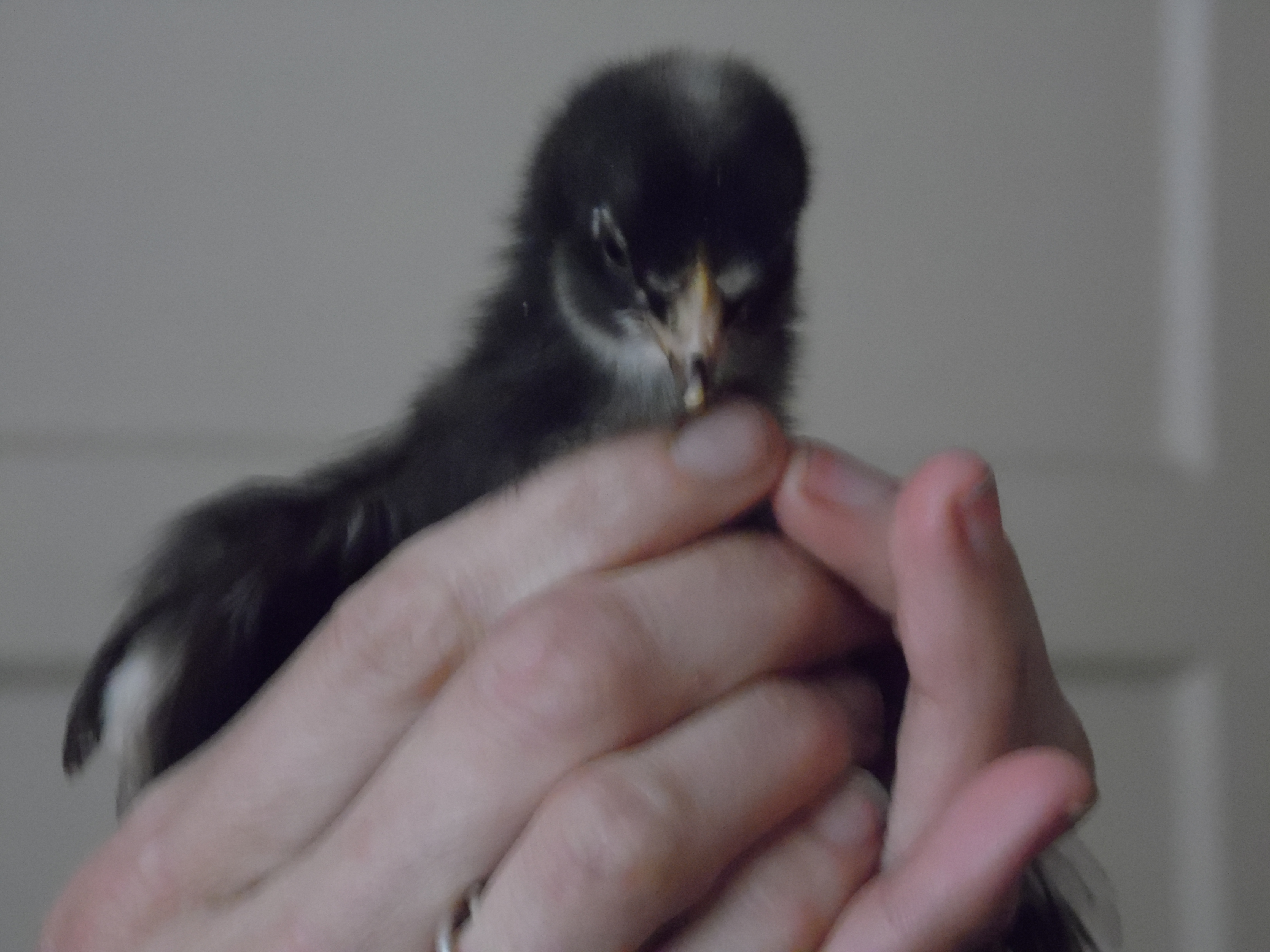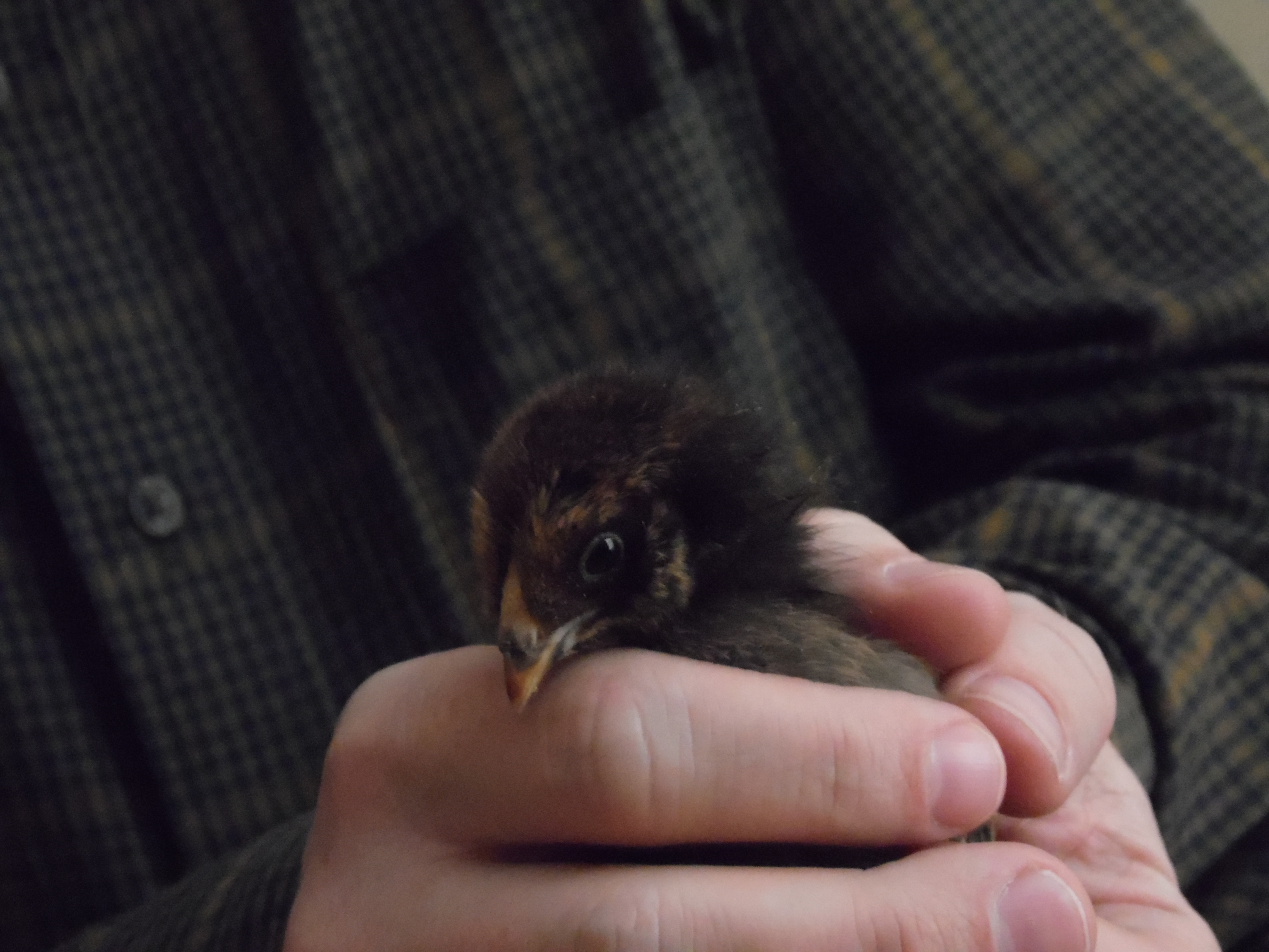 The girls are looking fine. We have only lost one of the infants (thus far and hopefully total!) and the girls are already showing vast personalities and trying to fly out of their plastic storage container. They ended up back in Emily’s room because of the cold snap that we did not expect. Two below zero is a smidge cold for little chickies. Emily is not pleased but is being a good sport. She is the only one with a cat proof room! They were banished last night from her bedside, however, for being stinky, loud, and jumping out of the box. When one of them escaped and pooped on her makeup box, that was the end of that. They are now in the bathtub (in her bathroom). New moms are no fun.