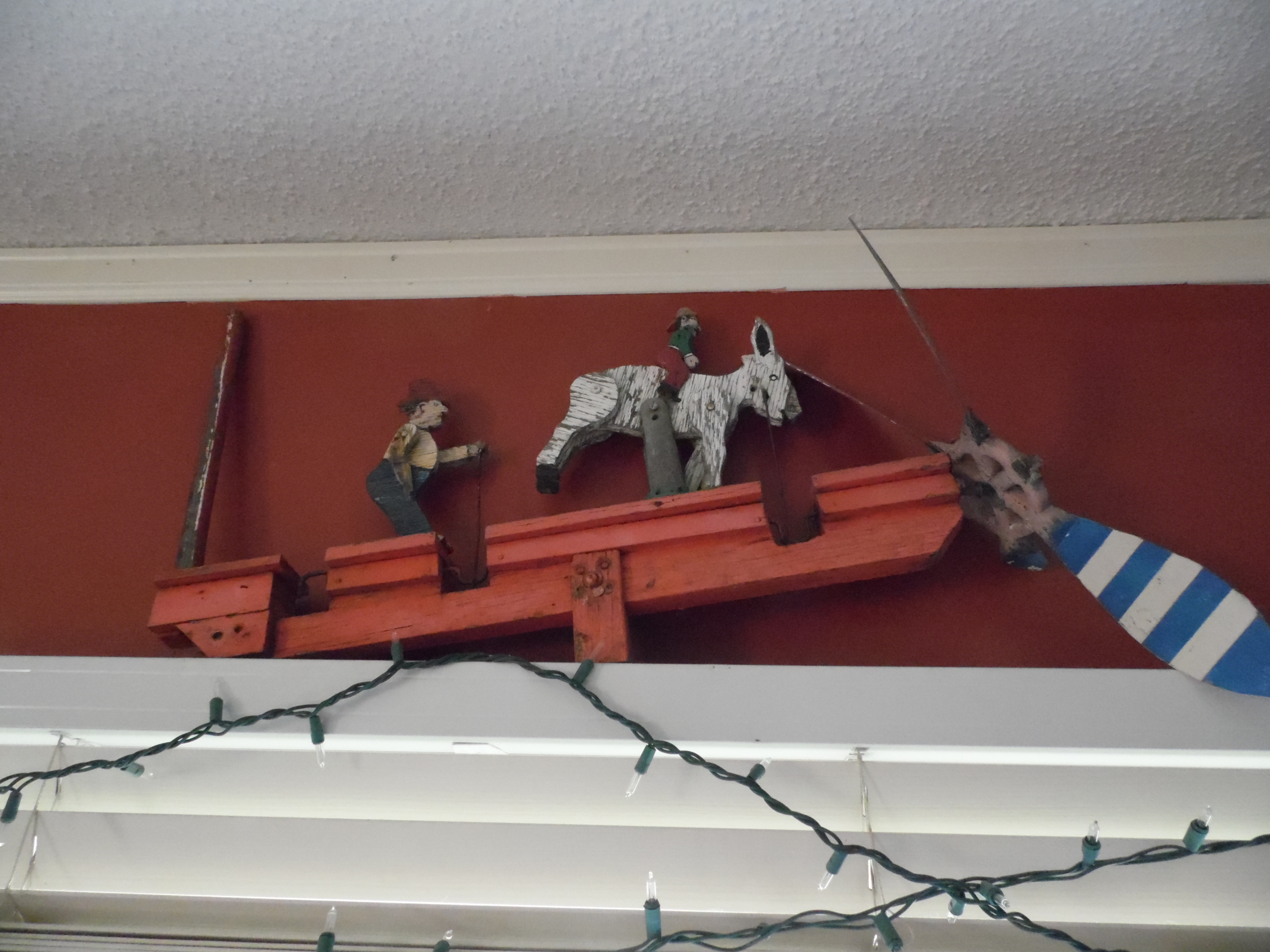 This piece was out in the yard in a pile of debris when we moved in. I salvaged it. I love its folk art appeal.