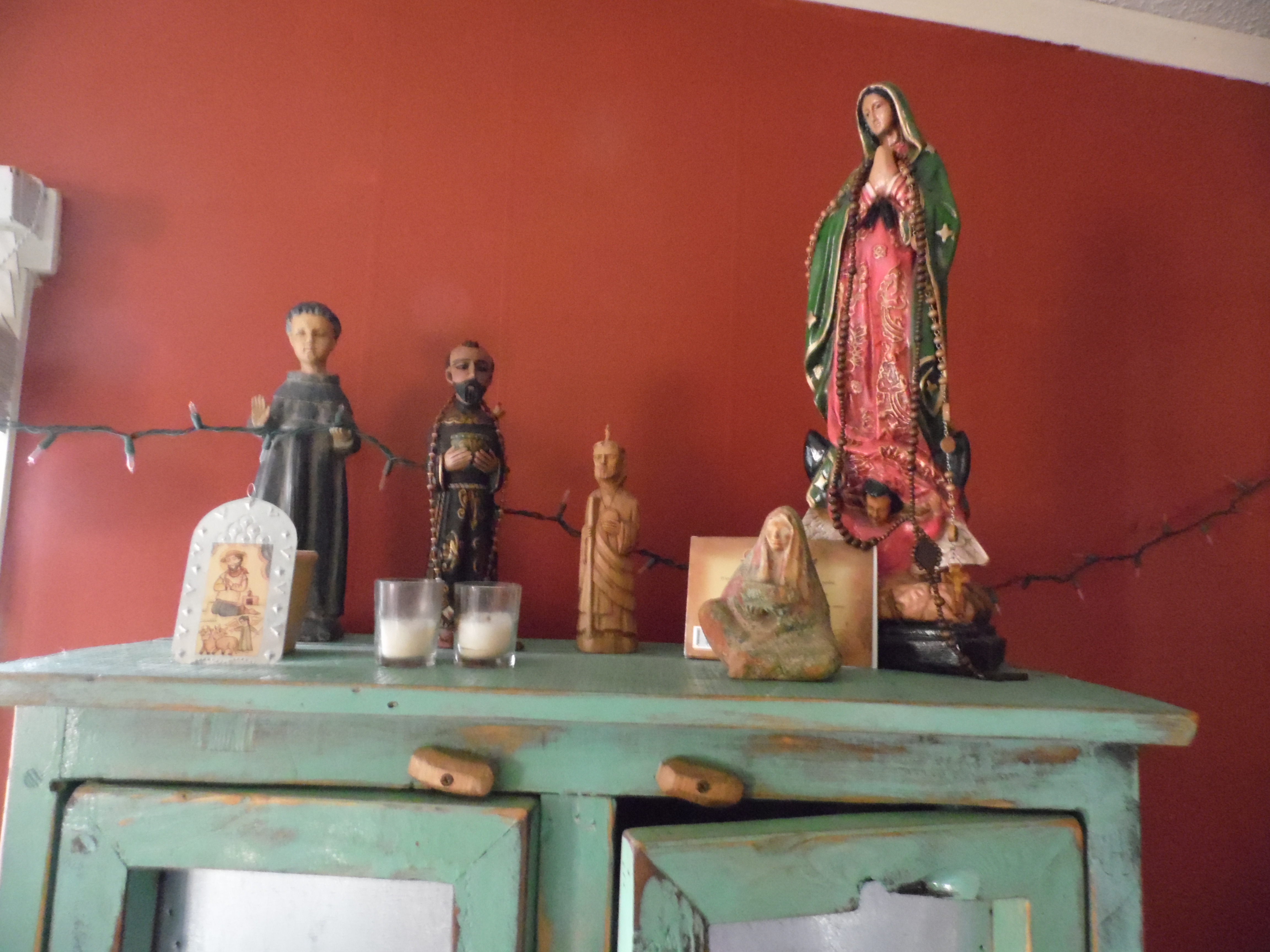 Fast forward…ahem…a few years and we are in our rented house on 2/3 of an acre. This house was built in 1920 and is just full of charm. It is a cute, little ranch style farmhouse. I painted it in colors that were warm and cozy to me. The huge windows cast such fantastic light in the winter throughout the open living room and in the summer it is shadowed and cool. I originally started painting it apricot, trying to create an adobe feel. It actually made me start to cry! It was so bright and little girl-like, I just stopped mid-wall and went and bought Cinnamon colored paint. You can do that. Don’t be afraid of bright colors. Color infuses the spirit of the place with warmth. Doug and I have decorated this place with Craigslist finds, antiques that we understand will have to be reupholstered at some point so we don’t stress over drinking coffee on the couches, or the cats climbing up the back. We filled it with items from our trips, or just trips to the thrift store. Items that remind us of New Mexico and the vibrant spirit there. Pick a place that you love…fill your home with things that remind you of it.