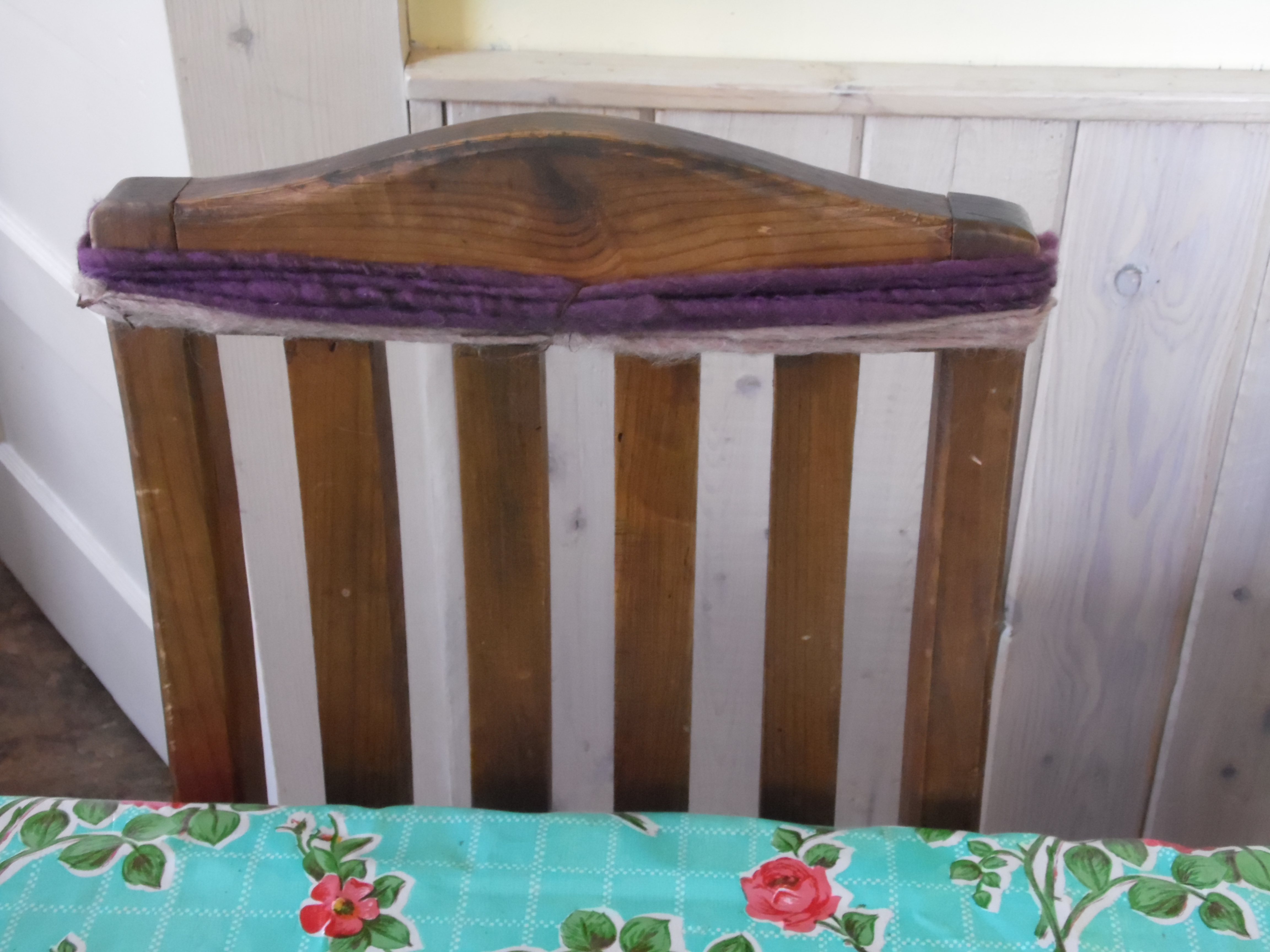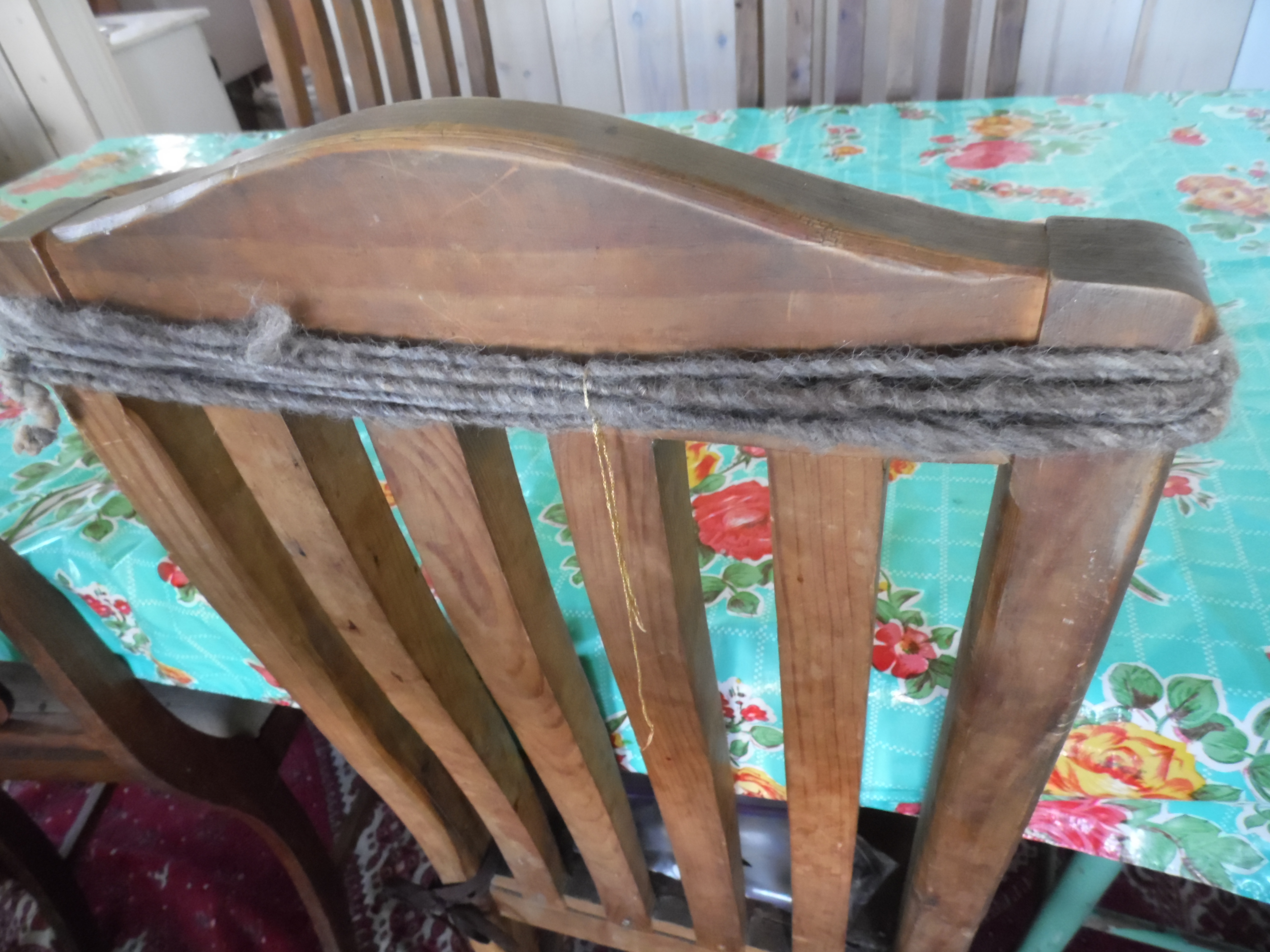 I took the other three “skeins” (you’ll see why that is in quotes in a minute) and tied four little embroidery floss ties on them, washed them as directed, and stretched them over the back of the chairs to dry.  Basking in the glow of aptitude and success, I started dreaming about how popular my yarns will be.  Our blend of alpaca and wool together being called wittily, Pacywoo, as Doug named it.