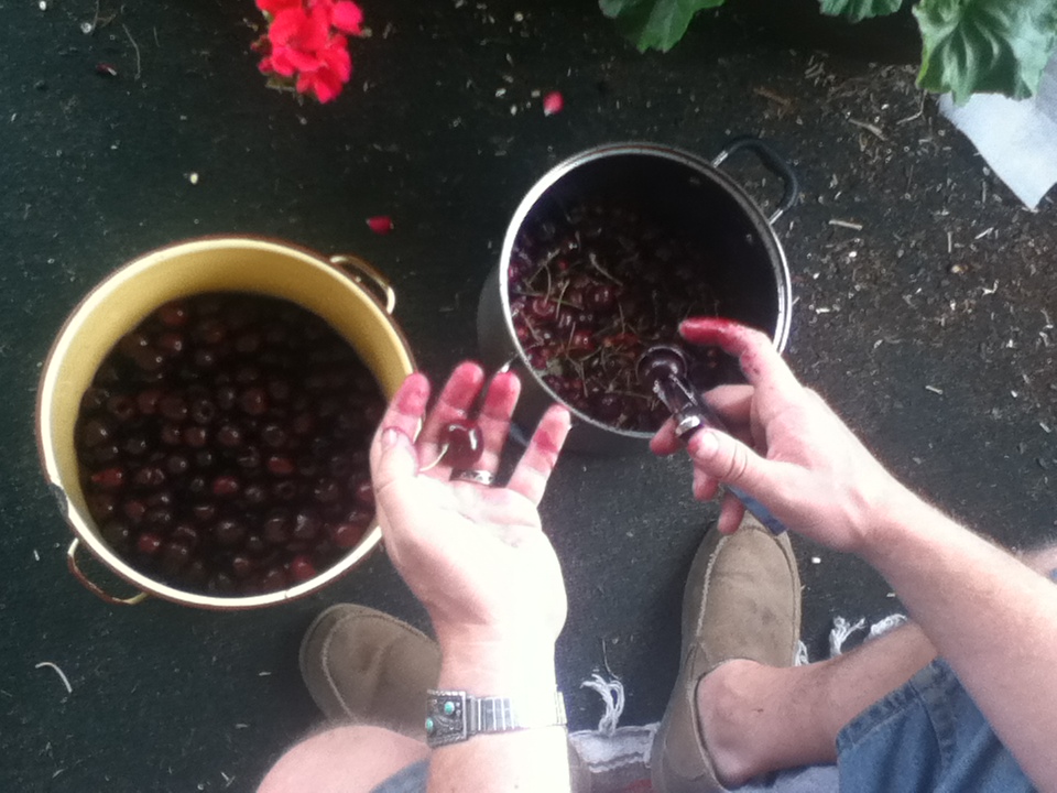 Exactly 4 cups of fruit with exactly 3 cups of sugar, with exactly 2 T of lemon juice, and exactly 1/2 ts of salt. BUT, I have two tons of cherries and no time or patience to spend four days canning small batches of jam! So, my friend directed me to a recipe that is very lax. Use as many cherries as you can fit in the pan with room for bubbling. Add 3/4 that amount of sugar. Add some salt and lemon juice and rind. Boil, boil, boil. Can. Easy! I now have eleven jars of delicious cherry….syrup!