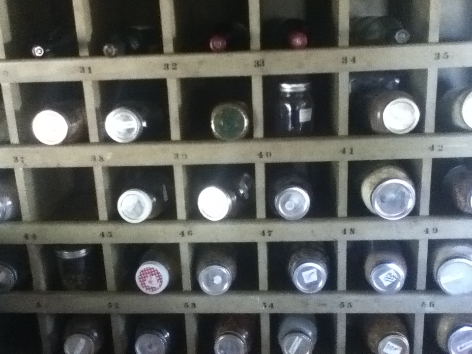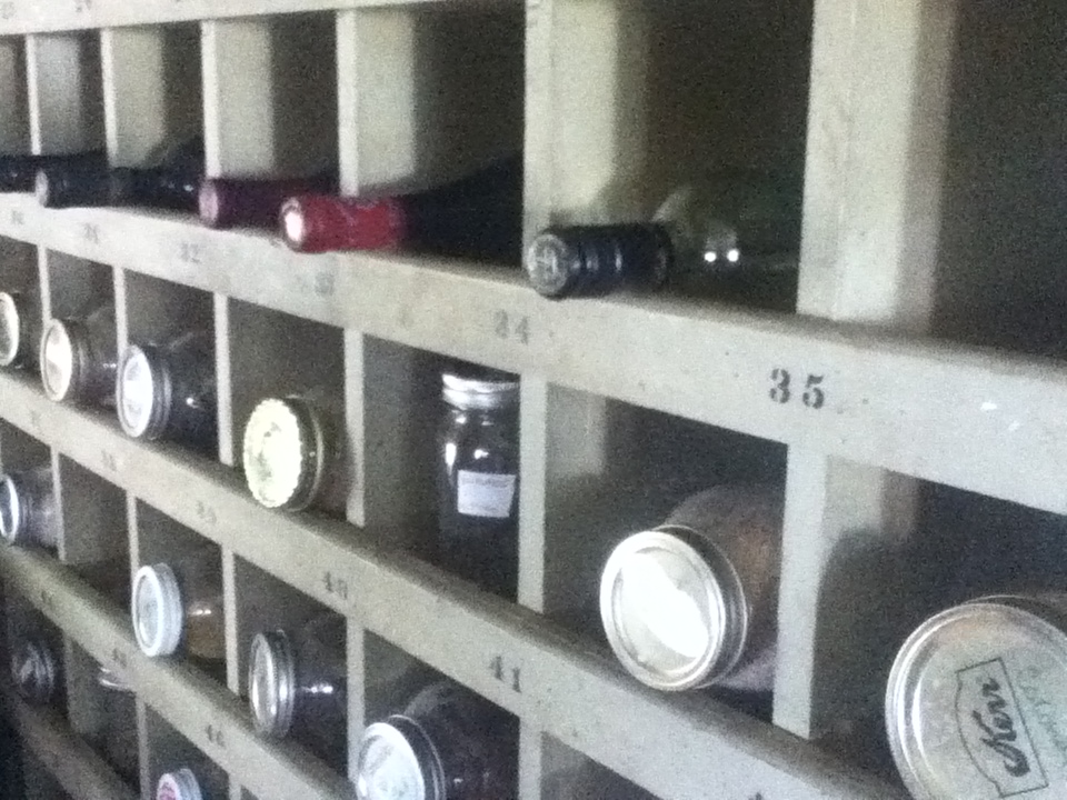 Organic bulk grains, nuts, seeds, beans, legumes, and flours are fairly inexpensive (two bucks a bag for beans) and can make several meals complete.  I store mine in canning jars so that I can see what I have.  Otherwise they become mountains of staples in the pie safe that I forget I had.  One positive thing about closing my retail front was reclaiming one of my display pieces.  It is a sixty plus year old hardware shelving unit with several cubbies.  I love the look of it, the numbered spaces, and the vintage appeal it lends to my kitchen.  It is becoming a wine rack/staples case.  Filled with canning jars of nuts, beans, and different grains and flours, and of course, wine, it will lend an easy air to cooking in my kitchen this winter.
