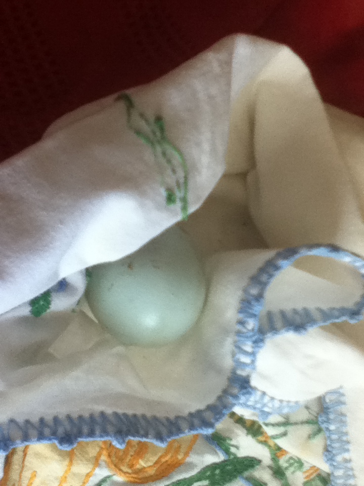 Our nine teenaged girls are becoming old enough to join the ranks of the other six as layers. We got our first egg from the new set of chickens the other day. It does look like a robin snuck into the coop and laid an egg. So adorable and precious. I would have never guessed that an egg could fit that description! Thank you, Sophia!