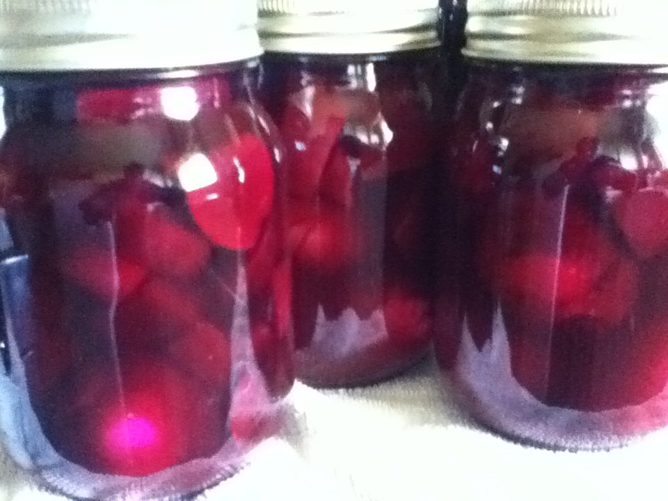 In clean pint jars layer sliced or chopped beets (I do not even peel them, just scrub them up.) with peeled boiled eggs to an inch from the top.