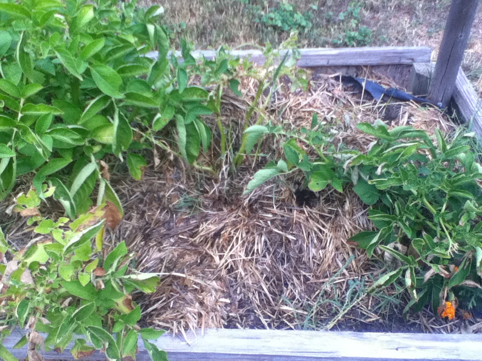 I mulched the potatoes as I placed hills over them, keeping their little round orbs out of sunlight. Green potatoes not being the most appealing, or healthiest, and covered them with straw. I haven’t had to weed them a bit. They keep snug in their golden carpet.