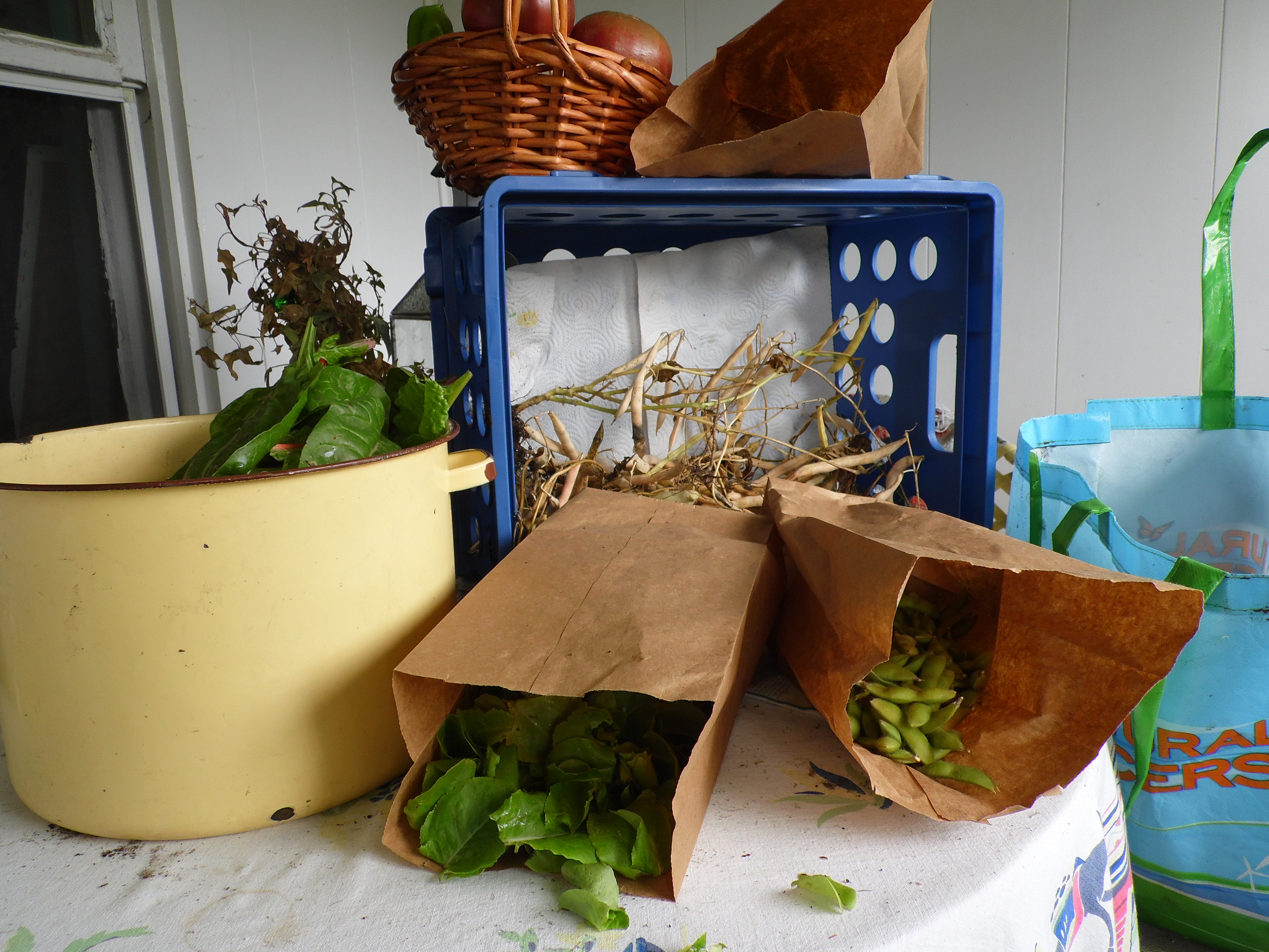Doug deftly found the beans that we are drying for winter stews and chilies. He filled quite a bag full. I found rich purple and red tomatoes, bright spicy chilies, and sweet, small peppers. Ear, after ear, after ear of corn. The other side of the gardens yielded two gallons of Swiss chard, kale, and collard greens. A gallon of fresh lettuce. A bag of soybeans to eat in front of a football game boiled just right with a little sea salt and chipotle. The last onion. A handful of cherry tomatoes. Spicy radishes making their second debut this year brought a spring to my step with each peppery bite. Piles of earthy potatoes just waiting to join onions and garlic in the cast iron skillet. And pumpkins. I do love pumpkins.