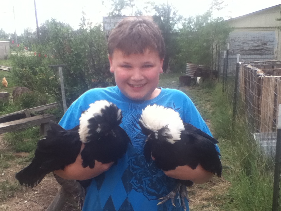 Our friends, Rodney and Pat, that I write about often, have a twelve year old son, Mark. As soon as he comes over, he heads straight to the chicken coop. They live in the city. They have cats and dogs. As far as I know, this kid has no experience with chickens. But they love him. He scoops up his girls, Aretha and Ginger (the Polish Rocks), and with one under each arm, coddles them and walks around the yard. So, she has her exception of whom she is partial to.