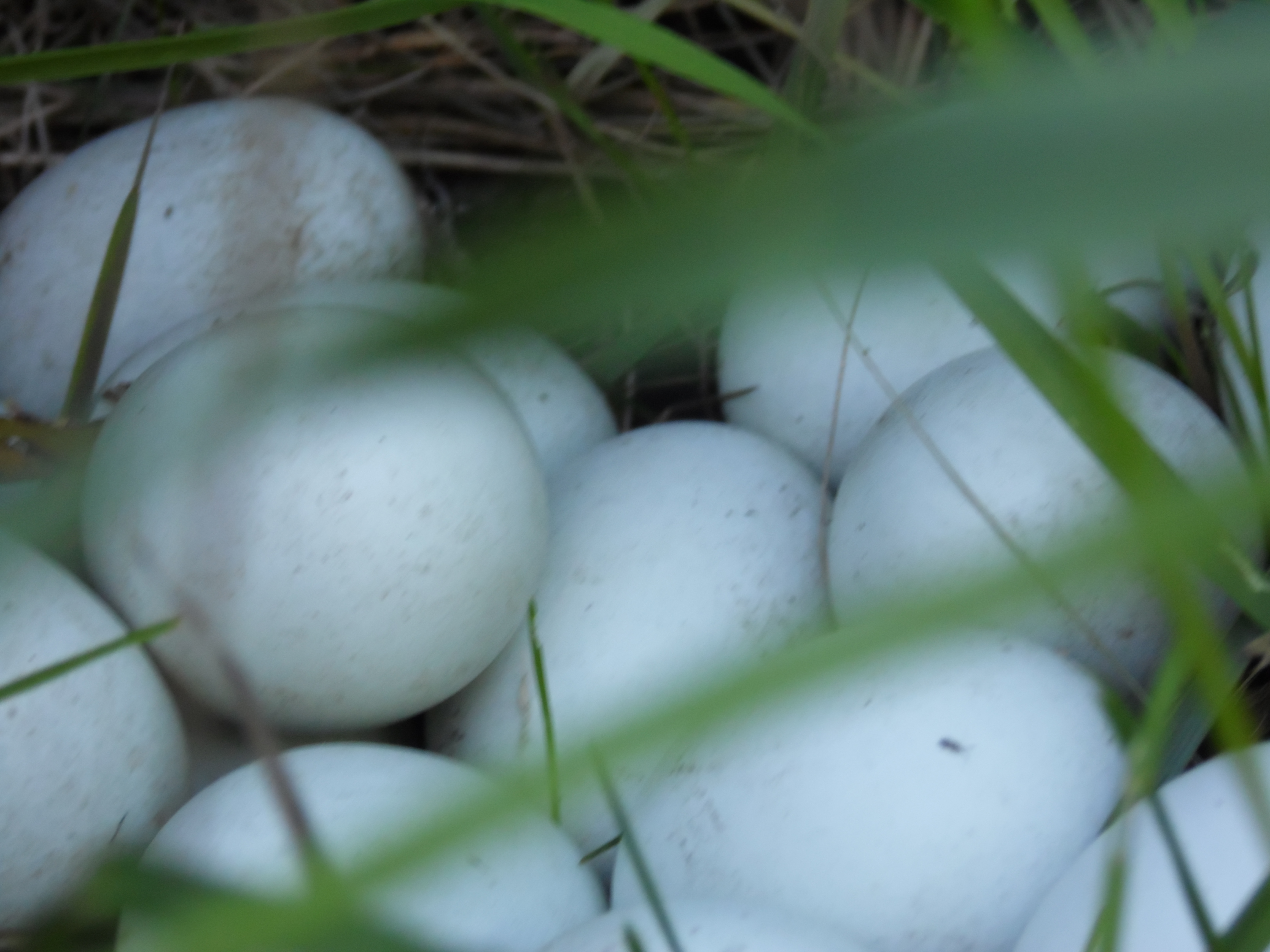 There are no ducks around here. And upon closer inspection the eggs are blue. My neighbor confirmed which two Araucanas were getting out. (the ones they have been chasing back into the back yard unbeknownst to me!)