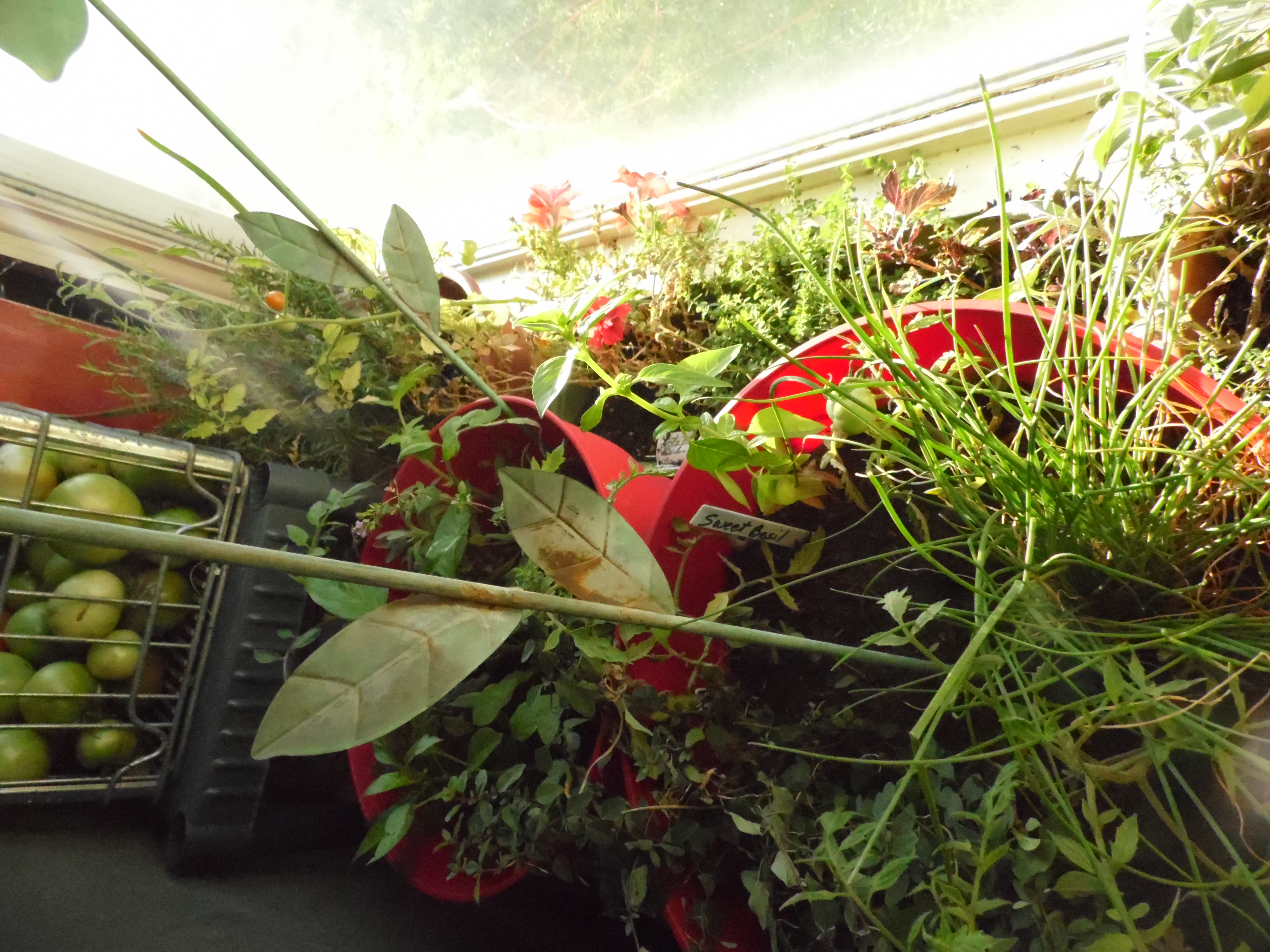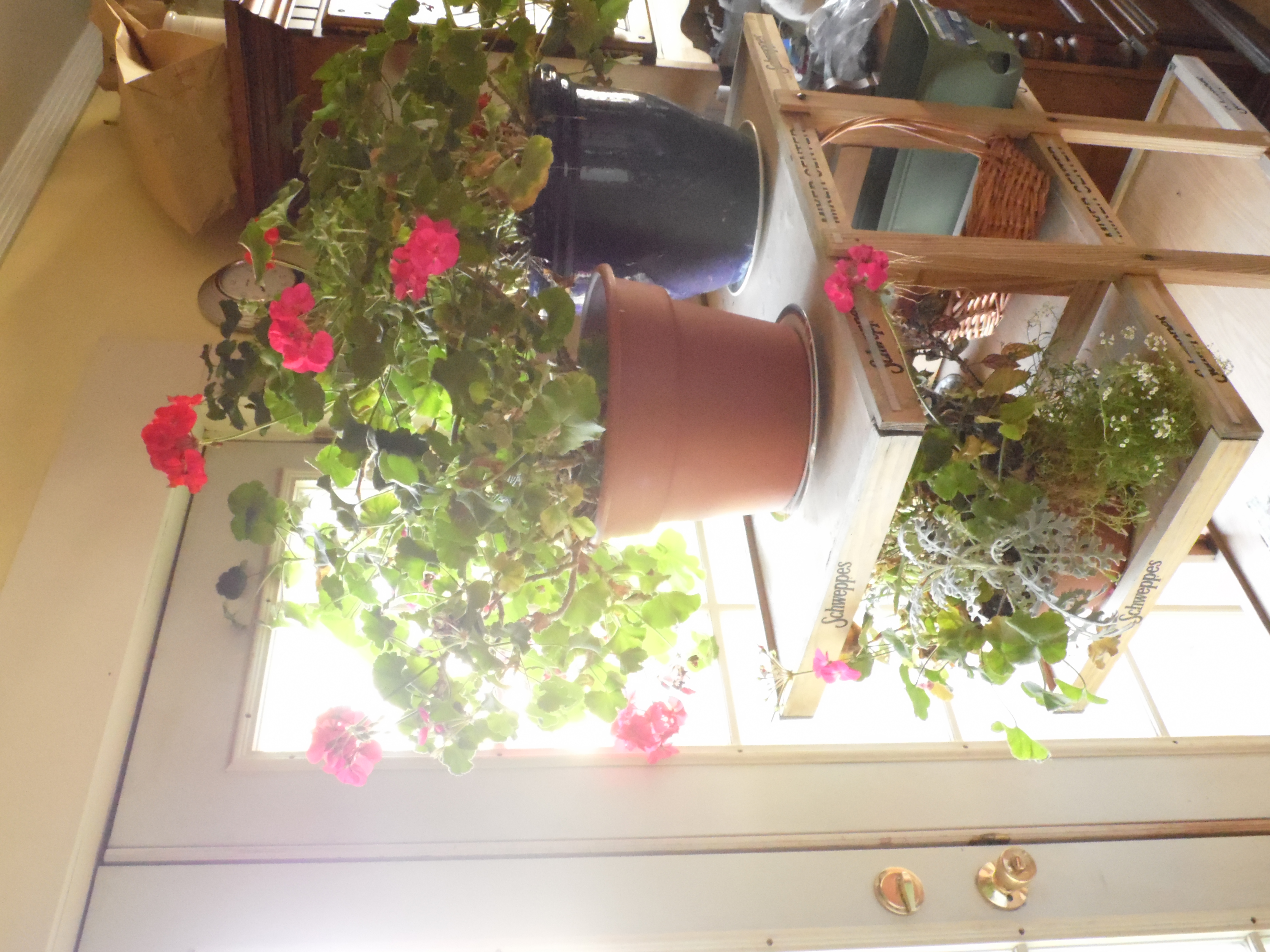The geraniums came in as well. By overwintering them in the house, the monsters are ginormous! They are a year and a half old and loving their life in the tropics.