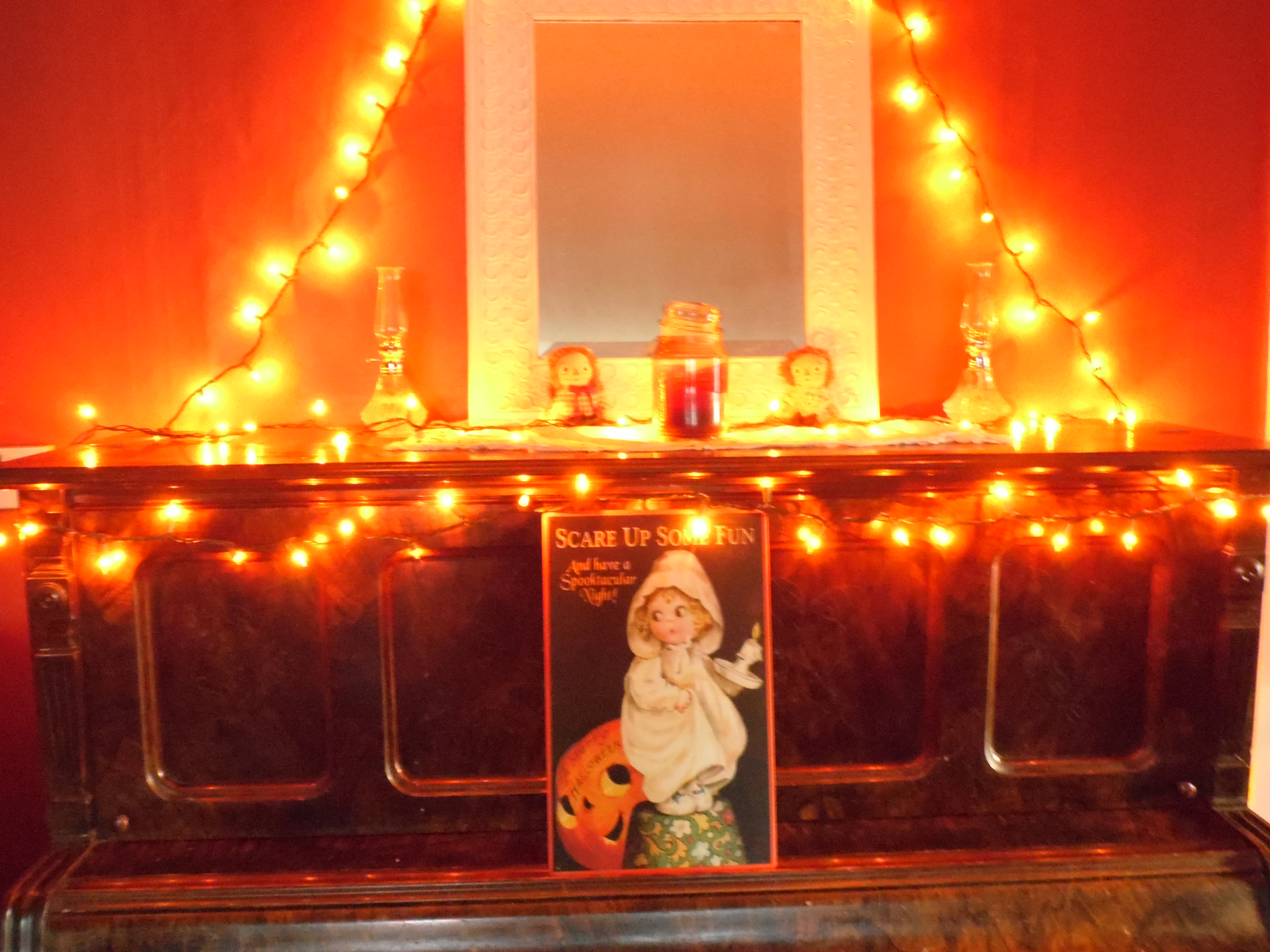 Indian corn on the table, orange twinkly lights, and pumpkin pie spice coffee. Happy Spooking!
