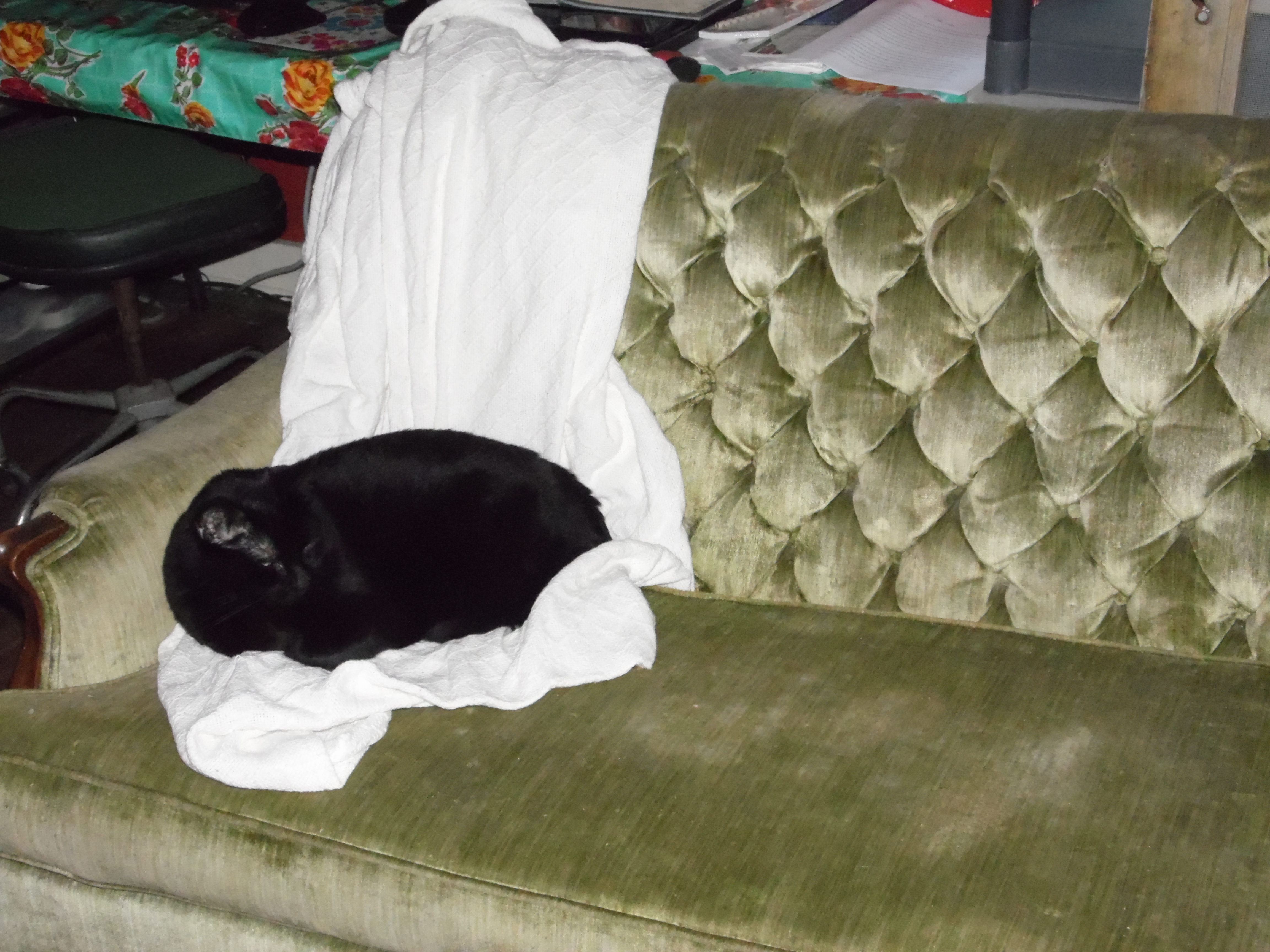 Getting those blankets out and throwing them haphazardly over seating, a black cat, and a pile of books invites people to curl up and relax.