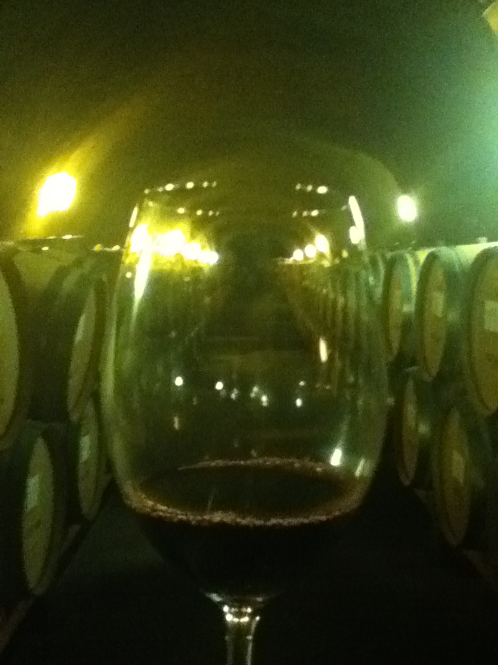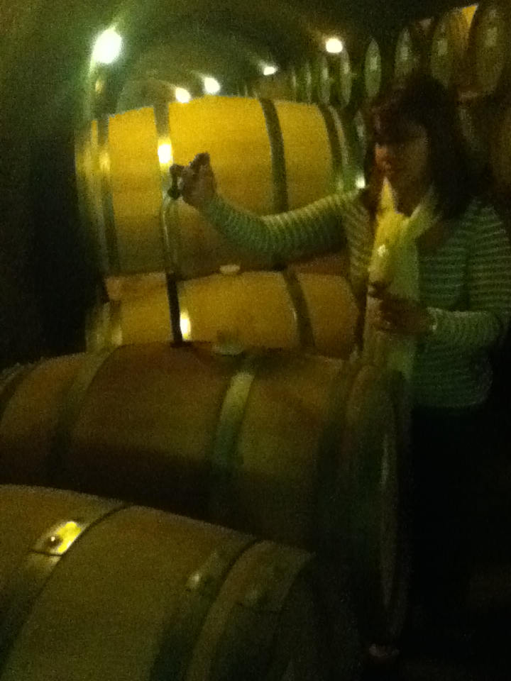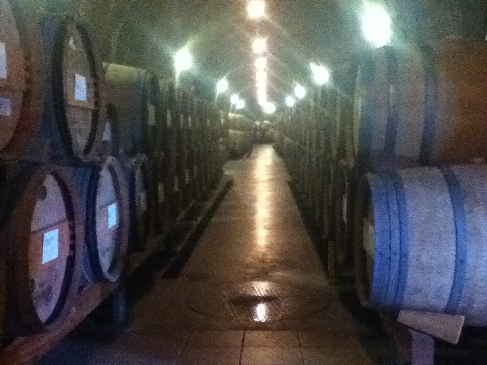 We walked through the warehouse-looking area where thirty feet high there were stacked newly harvested and resting wine hovering in French oak barrels.  Enormous steel tanks held bubbling early fermentations of wine.  We walked into the cave.  Several miles of caves exist under the buildings.  Rows and rows of oak line the walls filled with their proud vintage.  We tasted a sample right out of the barrel.  It was delicious.  Creamy, interesting, smooth, filled with berries, molasses, spice, and vanilla.  We walked further down the cool caves (incidentally only three degrees cooler than my basement…I can do this!) and came upon a beautiful round table with three dozen shimmering glasses and small plates of cheese.  We went through three tastes of wines, each delightful with its chosen cheese, and savored the romantic cave atmosphere.