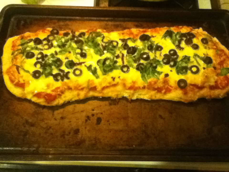 Add half a cup of white flour to the top and work it in with a wooden spoon by pulling up the sides of the dough along the bowl. Knead 15 times and cut in half. Dough shouldn’t be too sticky anymore. Freeze half of the dough for a later dinner (just defrost overnight). Roll dough out on a cookie sheet or in a cast iron skillet.