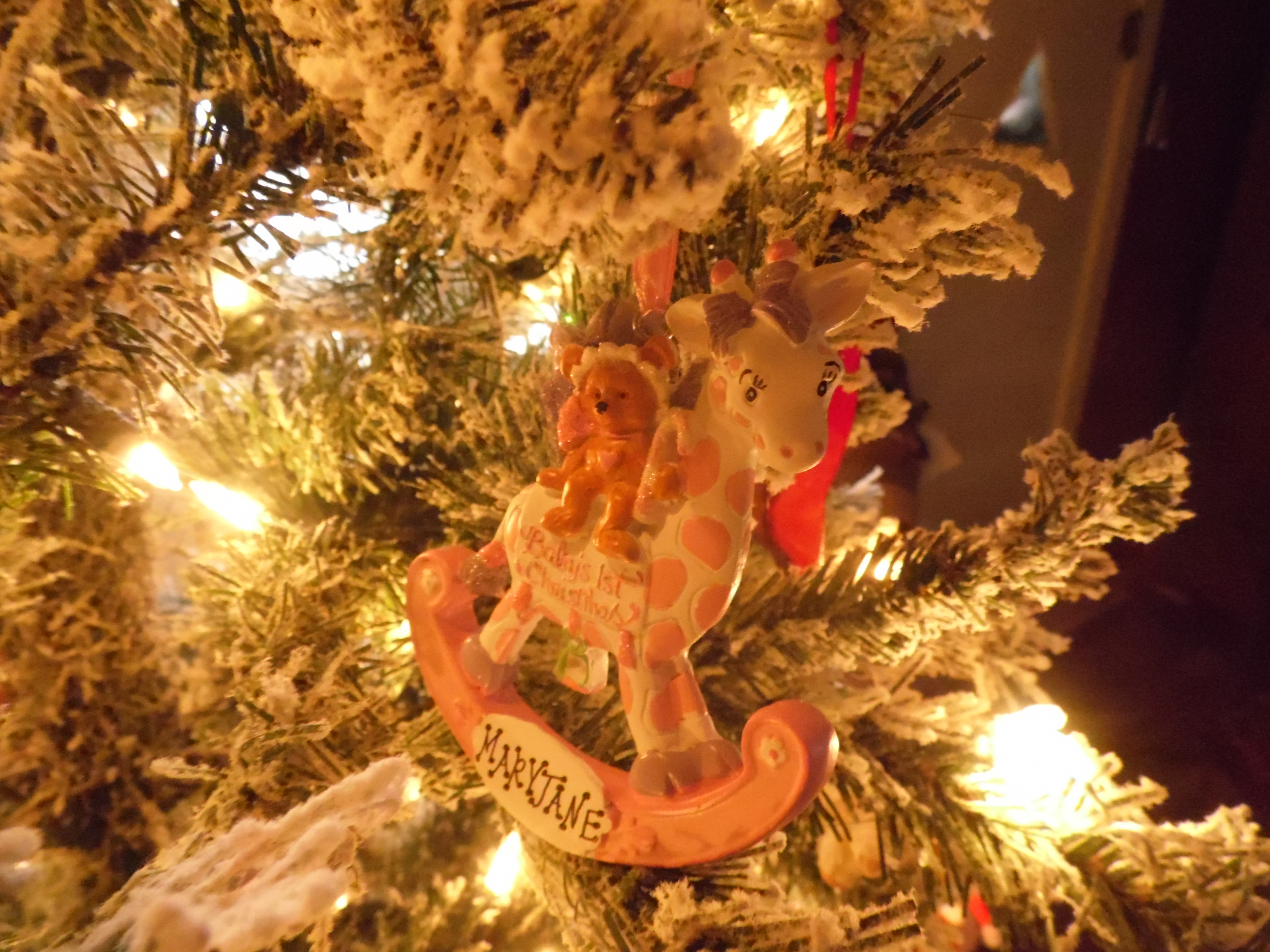 Our tree is covered in funky ornaments the children made over the years.  Doug and I purchase an ornament everywhere we travel.  Our tree is covered in memories of the Caribbean, Taos, and Glenwood Springs.  Each of us have ornaments with our names on them.  We have ornaments for the kitties that all passed away at the same time one year.  We have ornaments from friends.  I still have my ornaments from when I was a child.  When Doug and I were married, being Jewish, he obviously had never celebrated Christmas, never cast his eyes on a tall, lit tree with childlike wonder, never hung an ornament on the tree.  Never had an ornament!  I had to catch him up, so for several years he received an ornament.  He has plenty of his own now.  This year Maryjane received her first ornament to put on the tree.