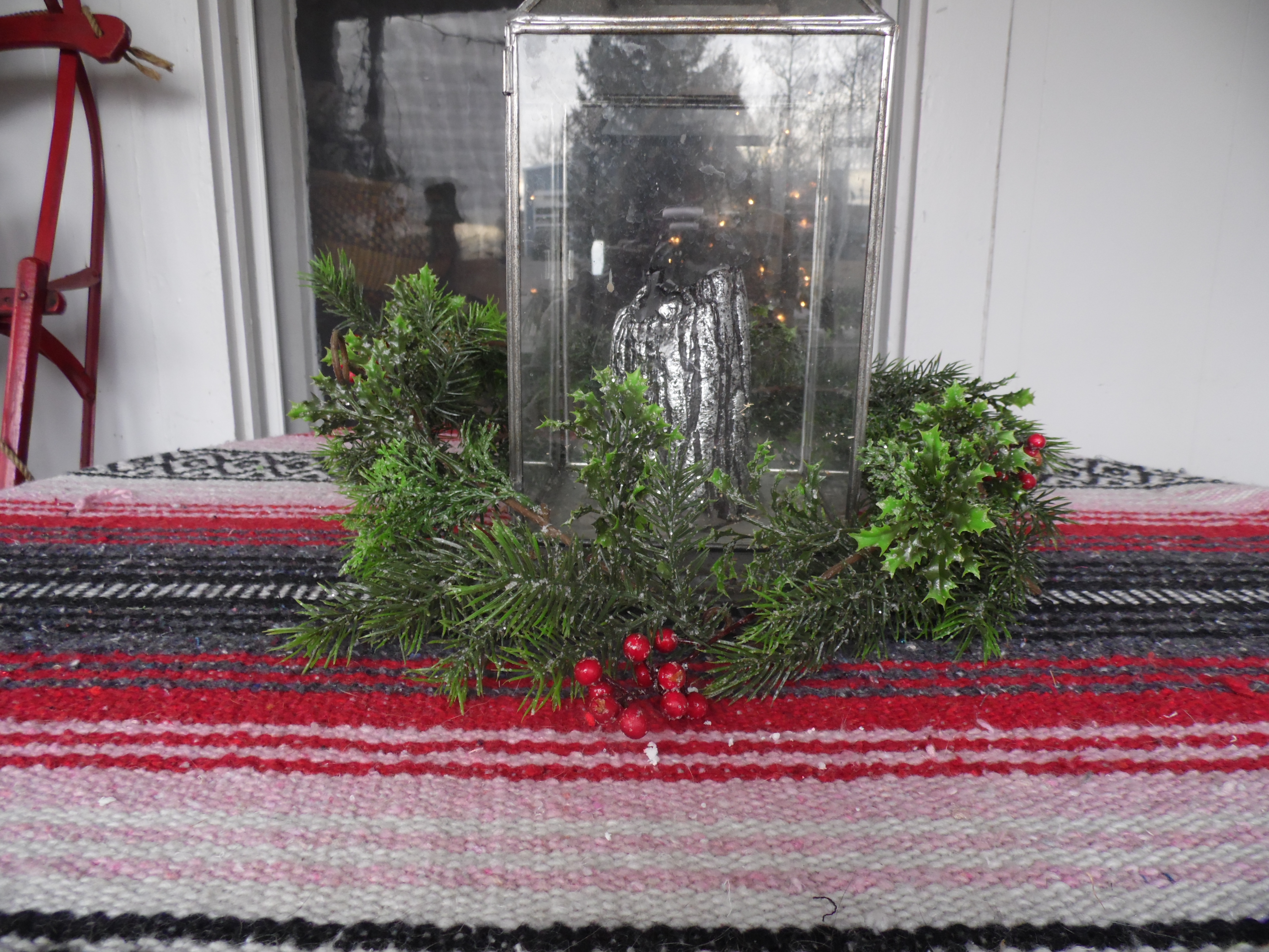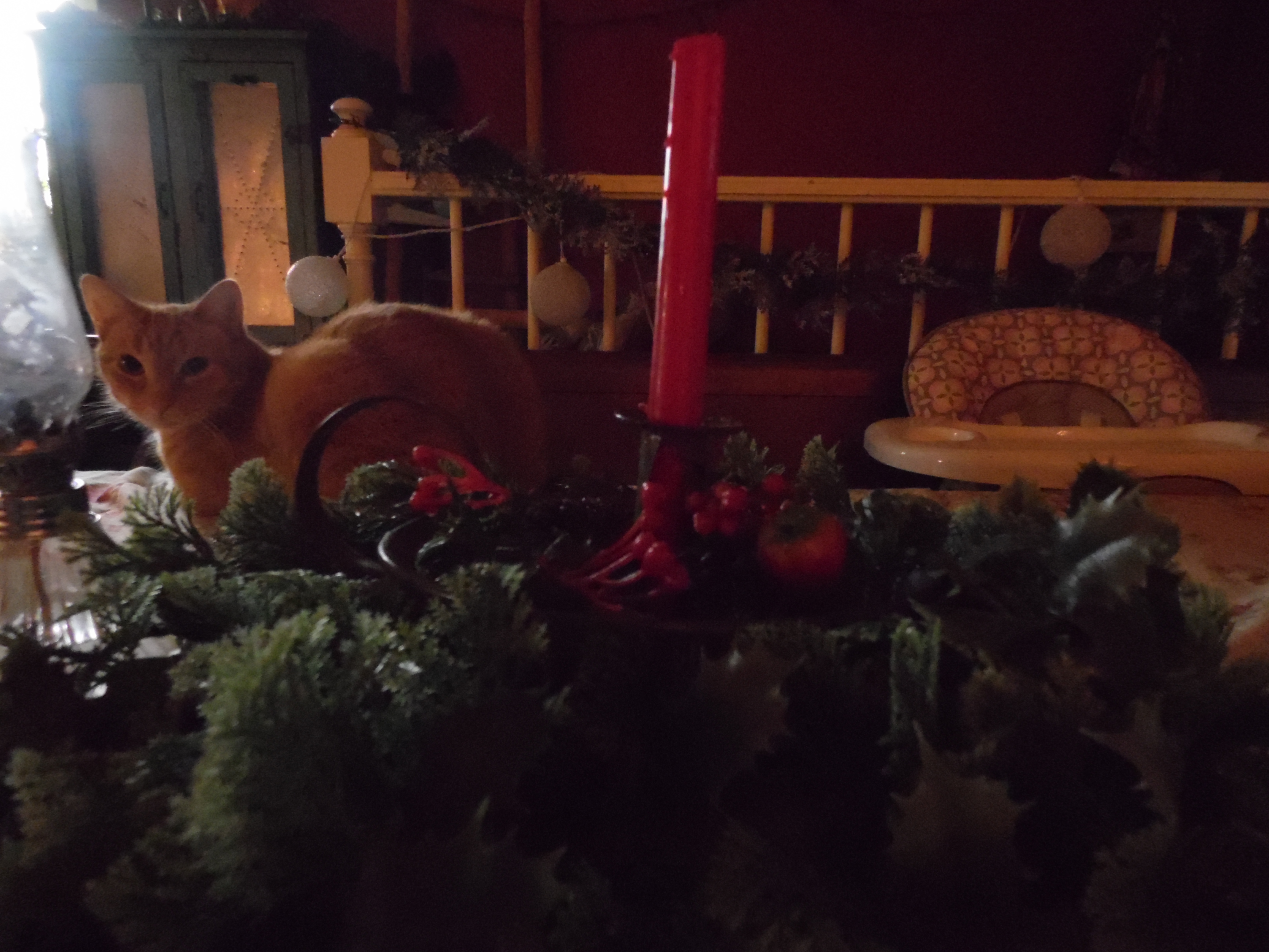 Most of the trinkets and small items were given away over the years.  The house resembles more Pottery Barn meets a farm then the blown up version of the North Pole.  But it still isn’t pristine or perfect (why is that cat on the table?).  We have baby items everywhere, last night’s coffee cups on the coffee table, and a few dishes undone.  A house should be livable, comfortable.  But, it is easy to create a beautiful landscape within your home with only a few touches.  Beautiful garlands laid over antiques, the television armoire, the bookcase, makes furniture instantly festive while keeping a stylish appearance.  Place a wreath in the center of the table and put a candle in the middle.  Red or white candles scattered around the house create the perfect ambience to counteract the earlier dusk outdoors.