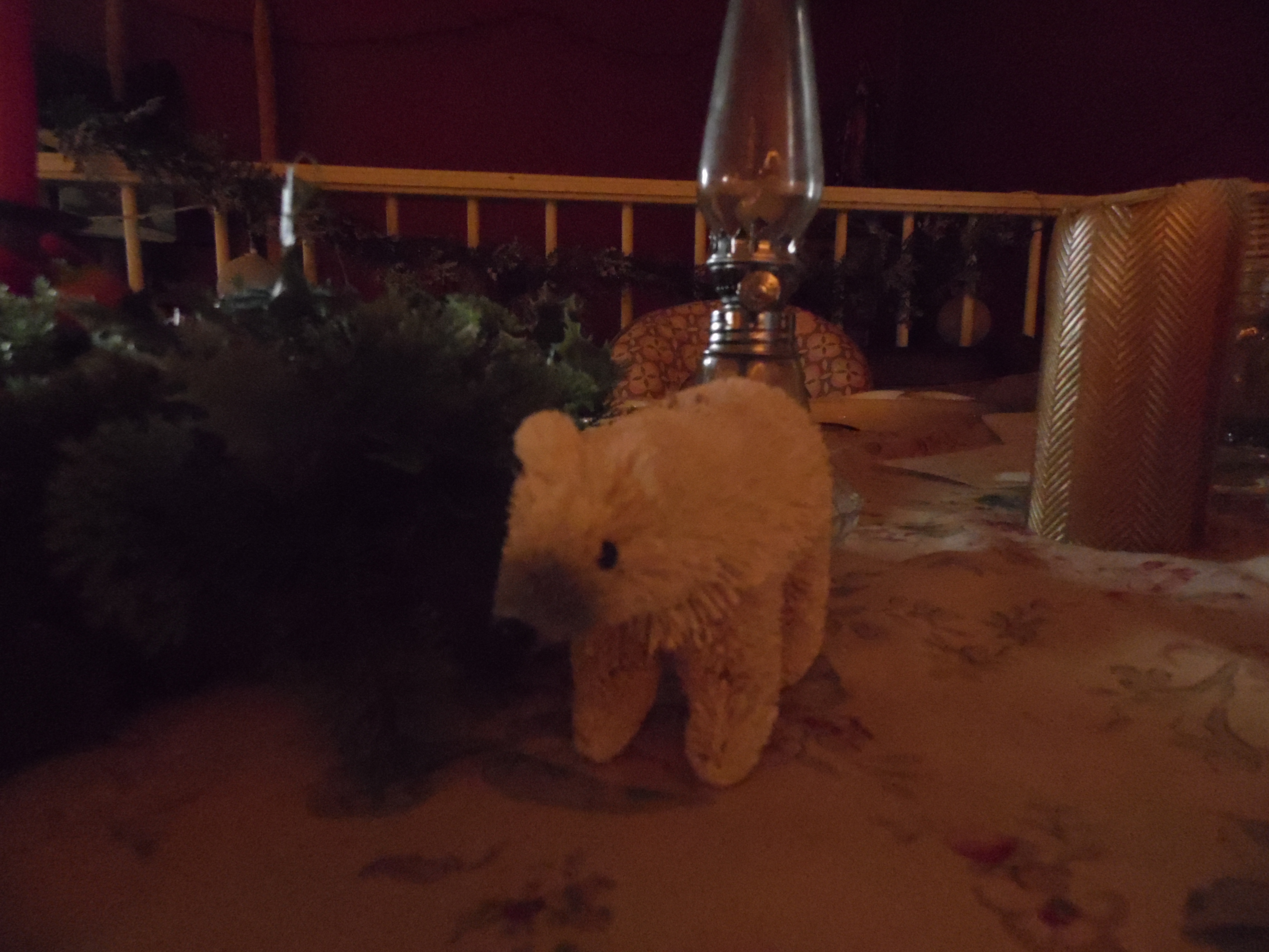 A bit of whimsy is always in order and our collection of wooden animals don their best during this season.  This is Juniper.  My first bear that Doug gave me for Christmas many years ago.