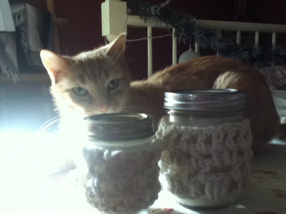 1. Seeing your candles brings a smile to me. Sitting next to my computer in the kitchen for the past few days has been a mason jar with a crocheted cover (like yours). It has a “sippy cup” cap. A guest left it here accidentally after a recent visit. It’s her handmade travel mug and I love it. 🙂