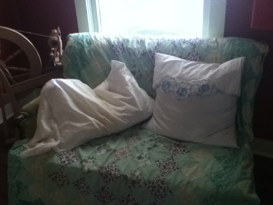 Surefit.com provided the means to reupholster the chairs seasonally.  Two lovely floral prints arrived by mail.  They can be washed, stored, and displayed all as I see fit.  Quilts and vintage pillows of desired pattern cover the sofas.  New inexpensive cushions are added to the rocking chair making it green with a homemade pillow of small red flowers instead of the gold and red plaid it was.  Two old throw pillows hidden inside a large sham from our sheet set instantly transform the other rocker.  A tablecloth of lovely print covers the tile coffee table.  Flowers can be added to any room to instantly add garden life to spaces.  Unnecessary knick knacks and decorating pieces that match the southwestern décor take a vacation to either the thrift store or the garage.  Everything is spiffed up, cleaned up, and new photos added to the wall.