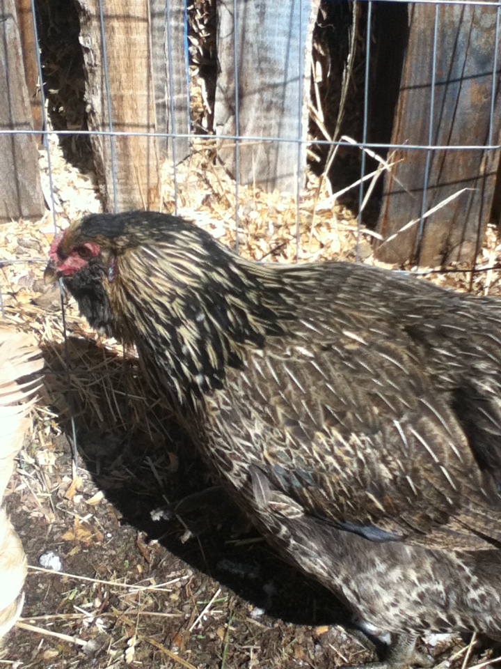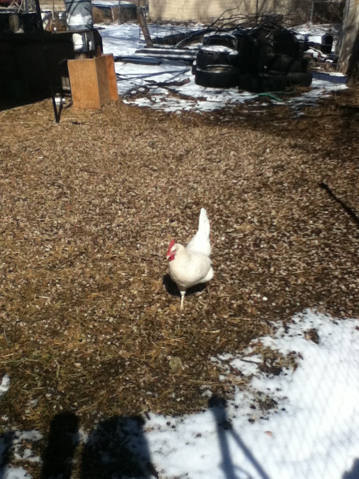 Our California girl, Ethel, was another breed that we got that year.  She is a great layer (again slowing down now) but she laid a white egg that was perfect for boiling and Easter eggs every day for a long time.  She is sweet.  She also likes to fly.  Not away, but into the goat yard.  The grass is always greener on the other side for California Whites.  She doesn’t leave our actual yard though.  A clip of a few feathers could keep a California girl in her own yard if needed.