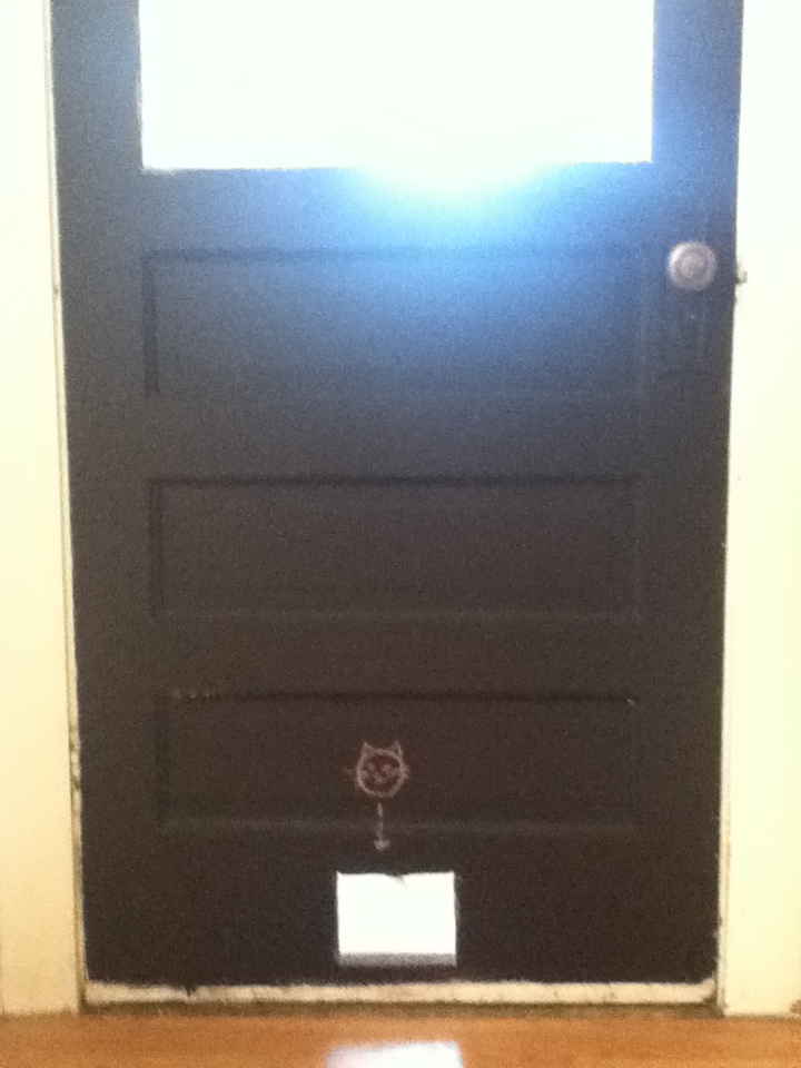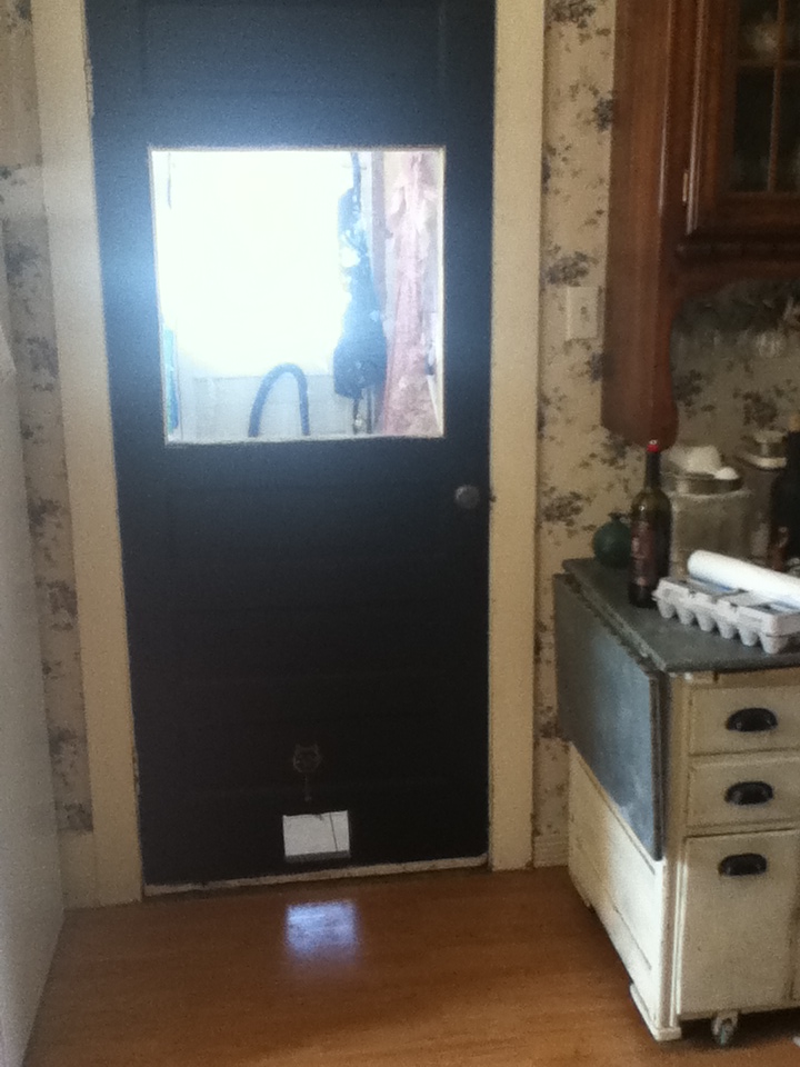 I painted the door leading from the kitchen to the laundry/cat room.  I thought it might be too dark in a room with white cupboards and light wall paper but the final look is dramatic and actually matches the old look of the kitchen.  It brought out the black vintage handles on the antique island and makes a stunning statement in an otherwise plain kitchen.