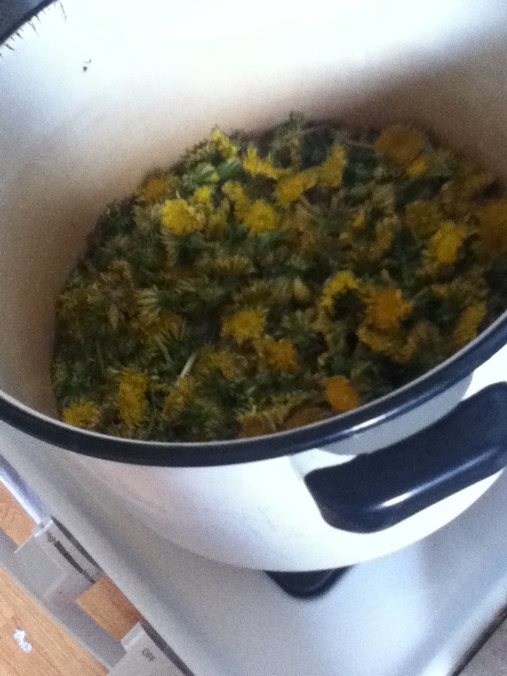 Put dandelion flowers into a soup pot and pour 2 quarts of water over.  Bring to boil and boil for about 4-5 minutes.