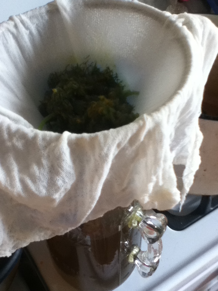 Strain through a cheesecloth and reserve 3 cups of dandelion water.
