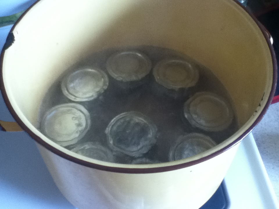 Pour into 4 ounce jars leaving a half inch head space.  Make sure lid rim is clean and replace lid.  Boil in water bath for 5 minutes.  Add one minute per 1000 feet altitude.  I live at 6500 or so feet above sea level, so I round up and boil the jars for 12 minutes.