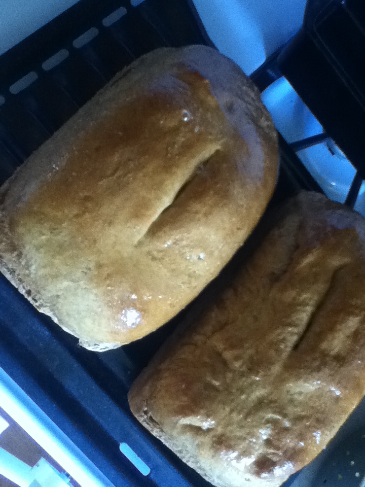 Divide into 2 loaves and place in 2 oiled bread pans. Bake at 350 degrees for 35-40 minutes. Brush tops with butter (and sugar and cinnamon if desired). After a half hour or so pop bread out and let cool completely on rack. (Without the cinnamon and sugar this bread can be used for savory sandwiches or meals as well as sweet.)