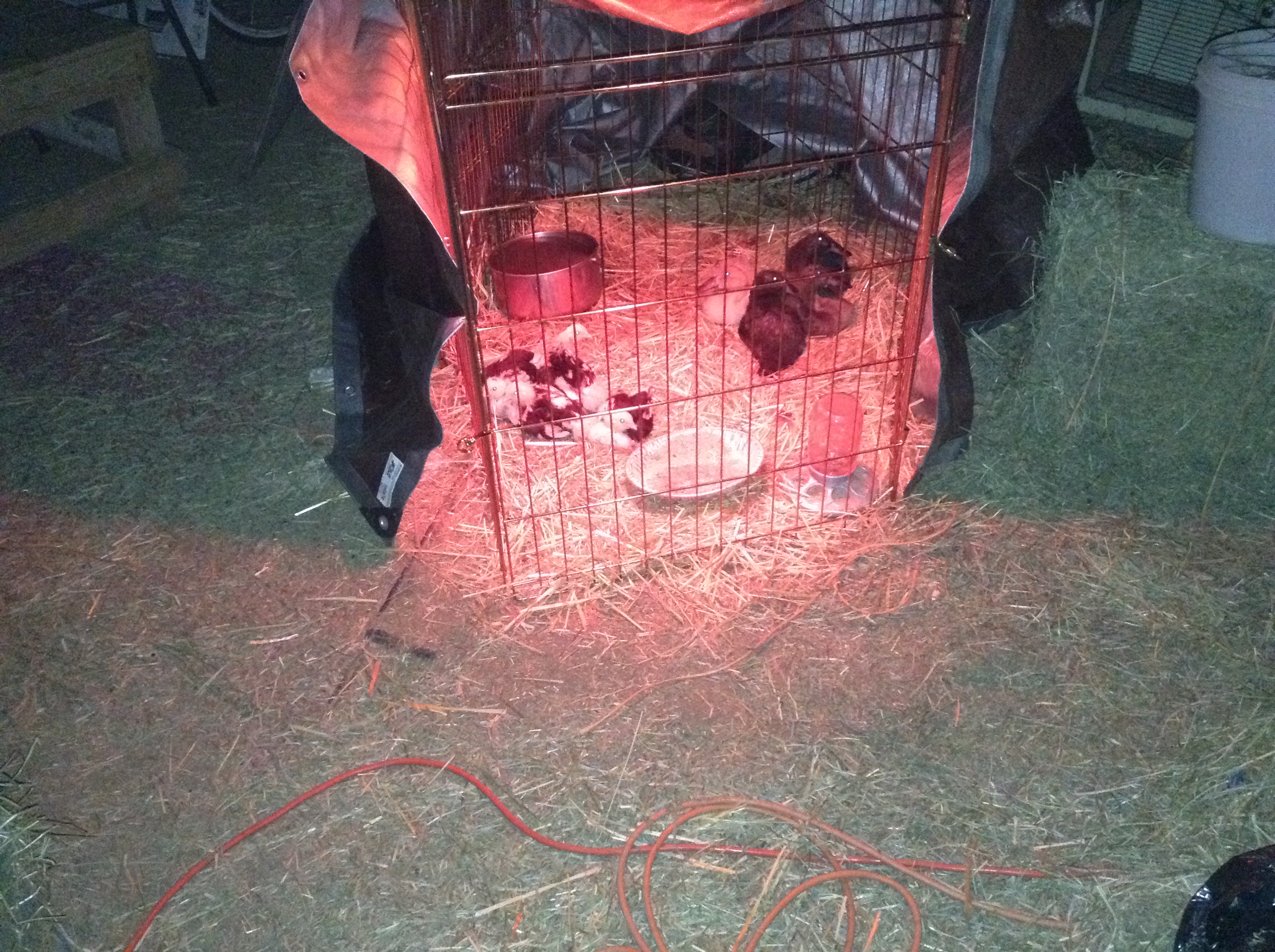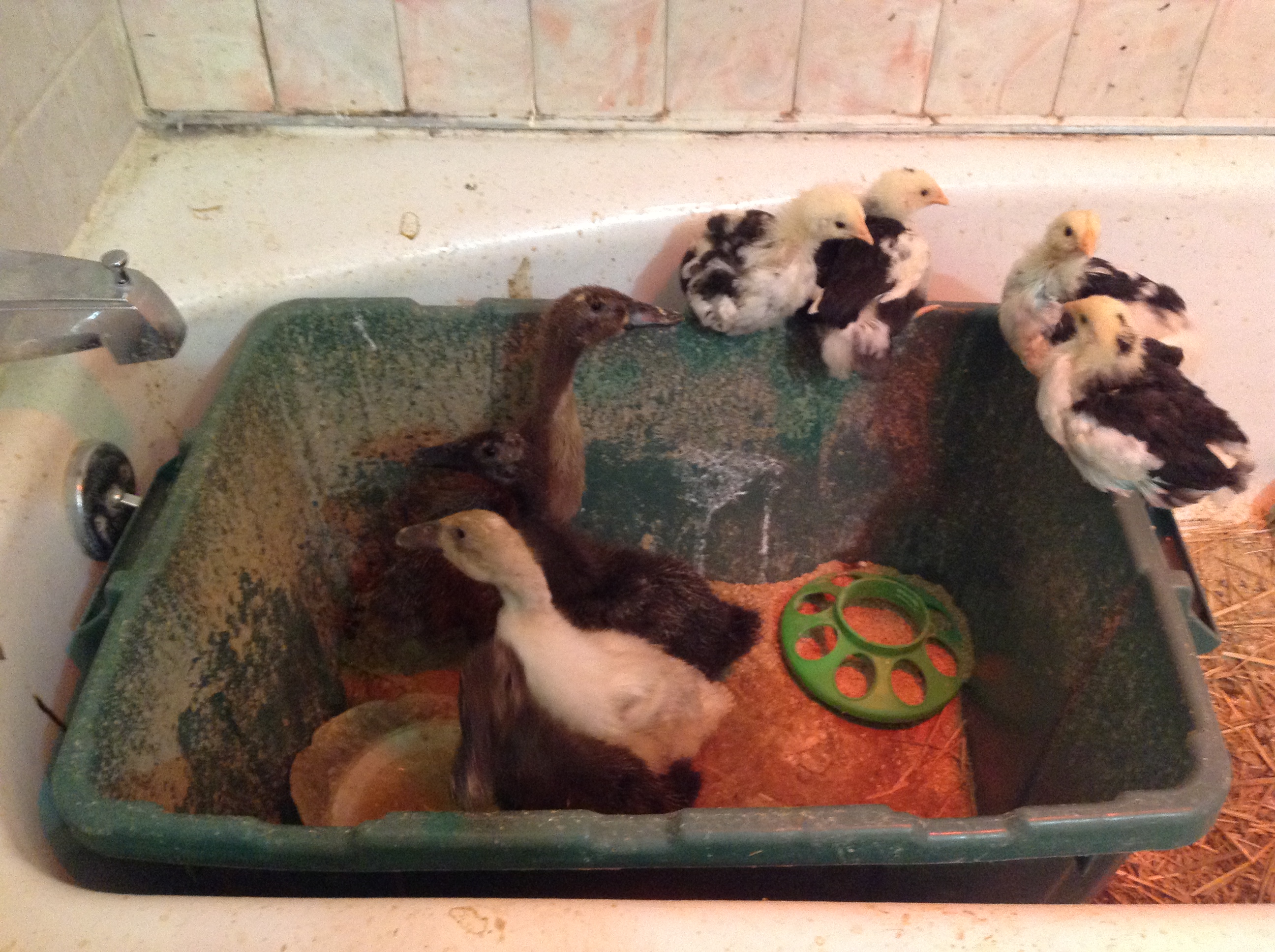 1 day old through four weeks old we destroy the bathroom. The bathtub is safe, weather free, continuously warm, and dry (except for the ducks). We set up a plastic tub in the bathtub with a little straw, their feeder and a cup of water. We attach the heat lamp rather low, just above the box. We dip each chick’s beak into the water to get them drinking. We check for poopy bottoms that need to be cleaned (just yank it off) the first couple of weeks. We see if the chicks are huddled under the light (too cold) or in the far corner (too hot) and adjust the lamp from there. The chicks should be running around. Raise the lamp a little each week.