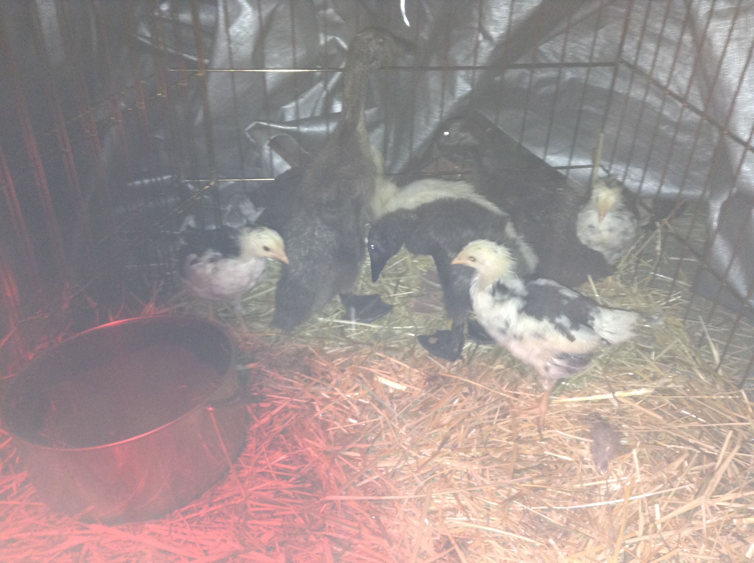 On their fifth week birthday the whole contraption moves inside the chicken coop. The chicks (and ducks) stay in the cage for another week while the ladies get used to them being there and all the ruckus.