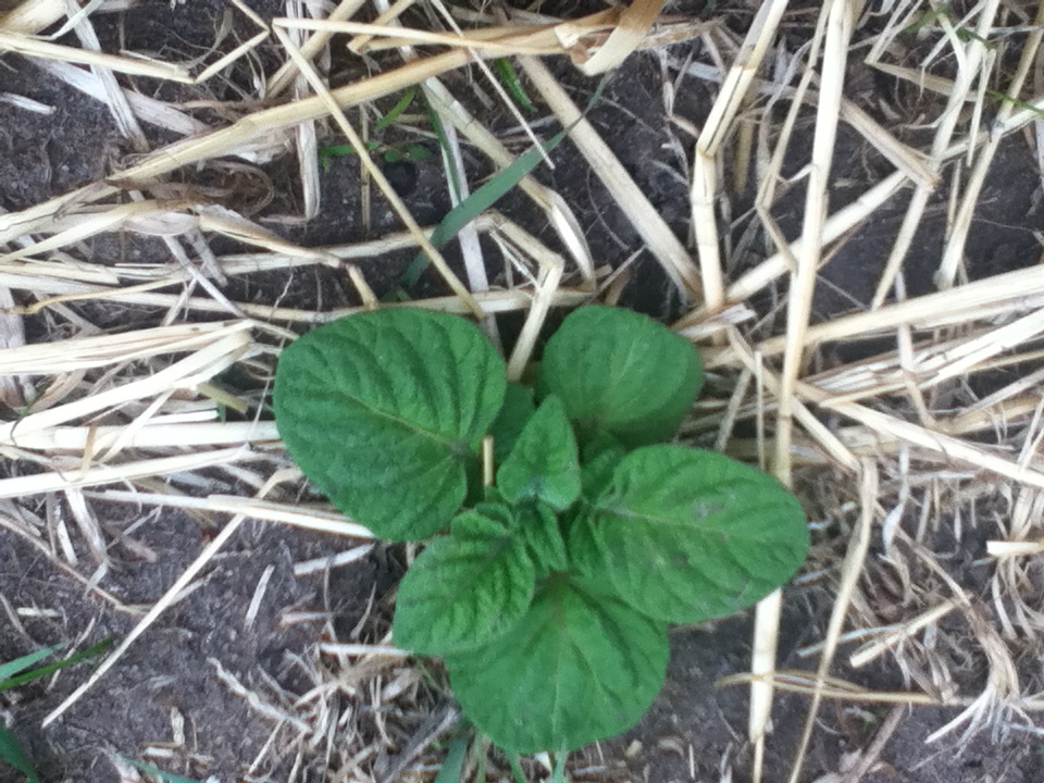My potato order didn’t come until late this year but I still go them into the ground.  In three long rows I planted potatoes a foot apart.  Red, white, and blue potatoes because I fell prey to middle of winter seed catalogues.  It sounded super fun to have flag colored potatoes underground.  The green shoots are just coming up.  As they come up I will then cover them snugly with straw, mounding it over the hills to suppress weeds and to keep the growing potatoes from receiving light.  This turns them green and makes them a bit of a tummy ache.