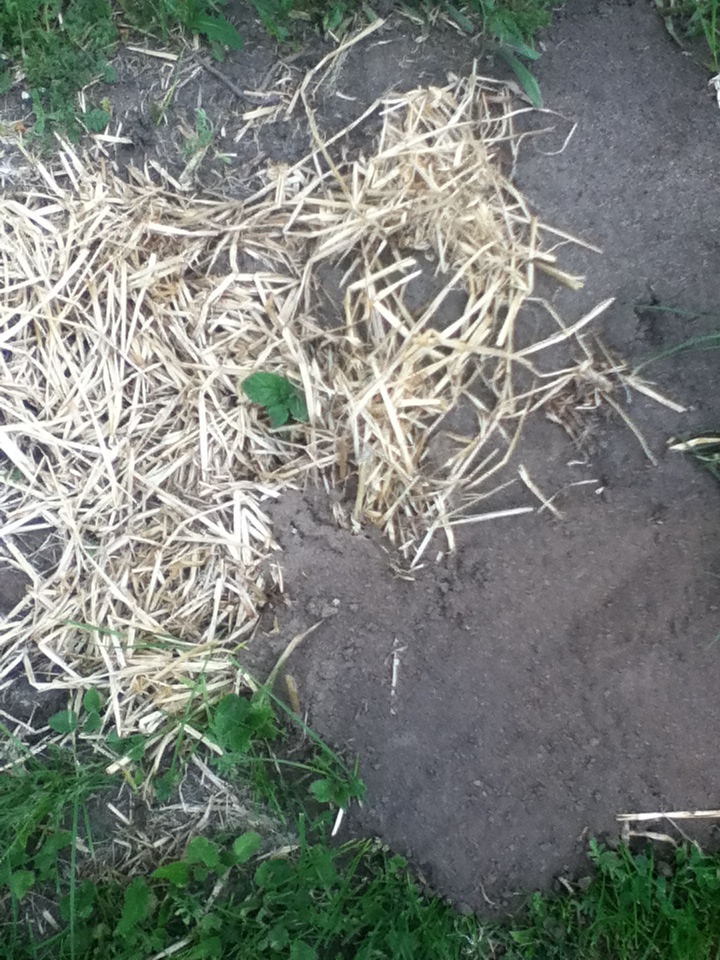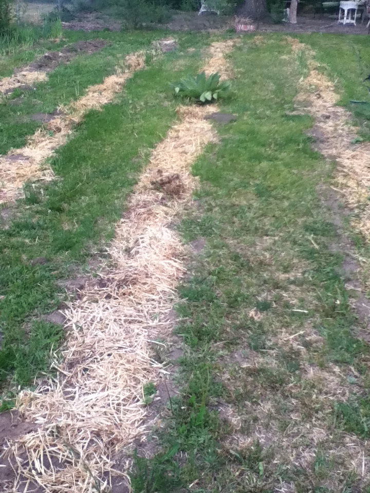 This year, I beat myself to the punch and put out the straw as I planted them.  The straw thirstily drank up all the water and didn’t let the ground beneath it get wet.  So, we moved the hay off.  Now that we have had a rain storm and daily waterings the straw will keep the moisture in longer.