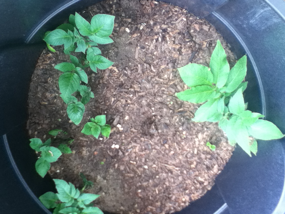So, I planted them in the two trash cans outside that I planted potatoes in last year with a see-what-happens attitude.  Last year’s didn’t work.  In the fall we dumped out two trash cans of very damp soil, not a potato to be found.  Already wet and composted and one with the earth.  This year we are watering the barrels less.  I planted the potatoes with the antennae-looking things pointing up.  A few weeks later I realized that those were probably the roots!  Well, somehow they have righted themselves and are coming up beautifully in the barrels.  They will be done before the long rows, didn’t cost me a thing, and made me feel like a homesteader.  (Oh my gosh, we are so far removed from our ancestors.  They are in heaven laughing I’m pretty sure.)  This year, I will save out potatoes to plant on purpose.  No seed catalogue order next year with any luck!