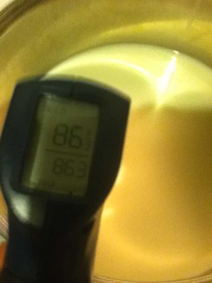 Pour one gallon of milk into a stainless steel pot. Heat, stirring often, to 86 degrees.
