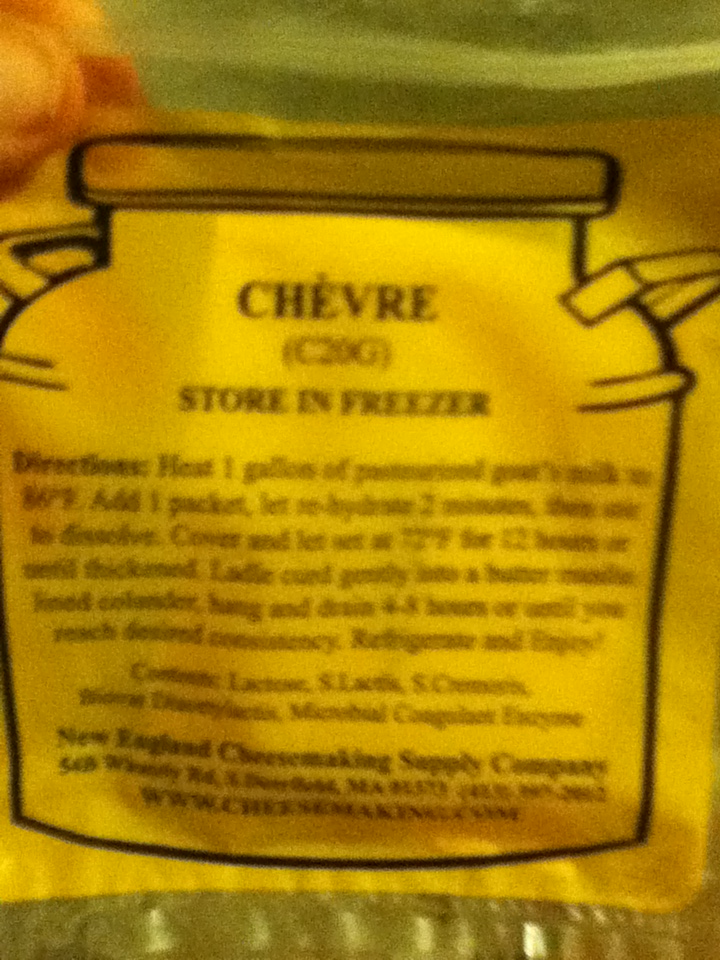 Sprinkle on a packet of cultures. These are the ready made cultures that we need to make a variety of cheeses. They are available at cheese supply websites but I get ours from the local homesteading store (Buckley’s in Colorado Springs) or the local brew hut (Dry Dock in Aurora) that sells beer and wine making supplies. Graciously, they sell cheese making supplies as well.