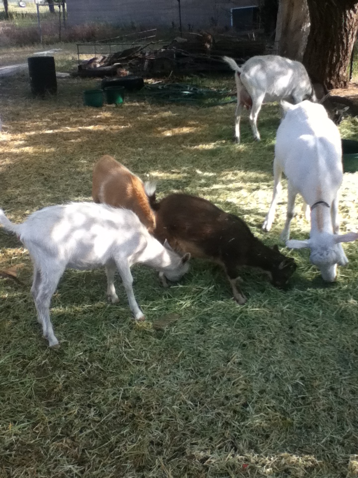 Goats love a good time. We have several discarded tires that are stacked up along with an old, rusty keg. Doug calls it Mount Kegel. It is a playground of fun (and used to reach the higher branches of trees). Goats are really fun to watch play. They head-butt (good thing they are disbudded) and jump 360’s off of wood piles and feeding troughs. One night Doug was in the pasture with them at dusk. Goats are particularly silly at dusk. He would run across the yard then stop and turn to look at them. All at once they would all rear up and start hopping on all fours like giant bunny rabbits….sideways towards him! It was the funniest thing I have seen in a good minute.