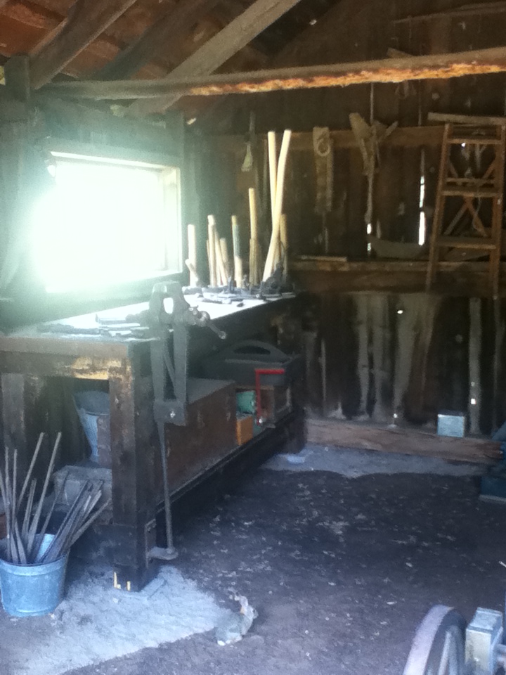 This is the blacksmith shop. A shed with all the important tools to provide horse shoes and for fixing iron implements around the farm. The buildings were placed in close vicinity to each other along the creek and house in order to block the winds from the southwest. Everything was close to the water as one could not exactly turn on the faucet and pay a water bill. I do dream of the day when I can use a grey water system to water my plants, not wasting a single drop, and have fresh well water.