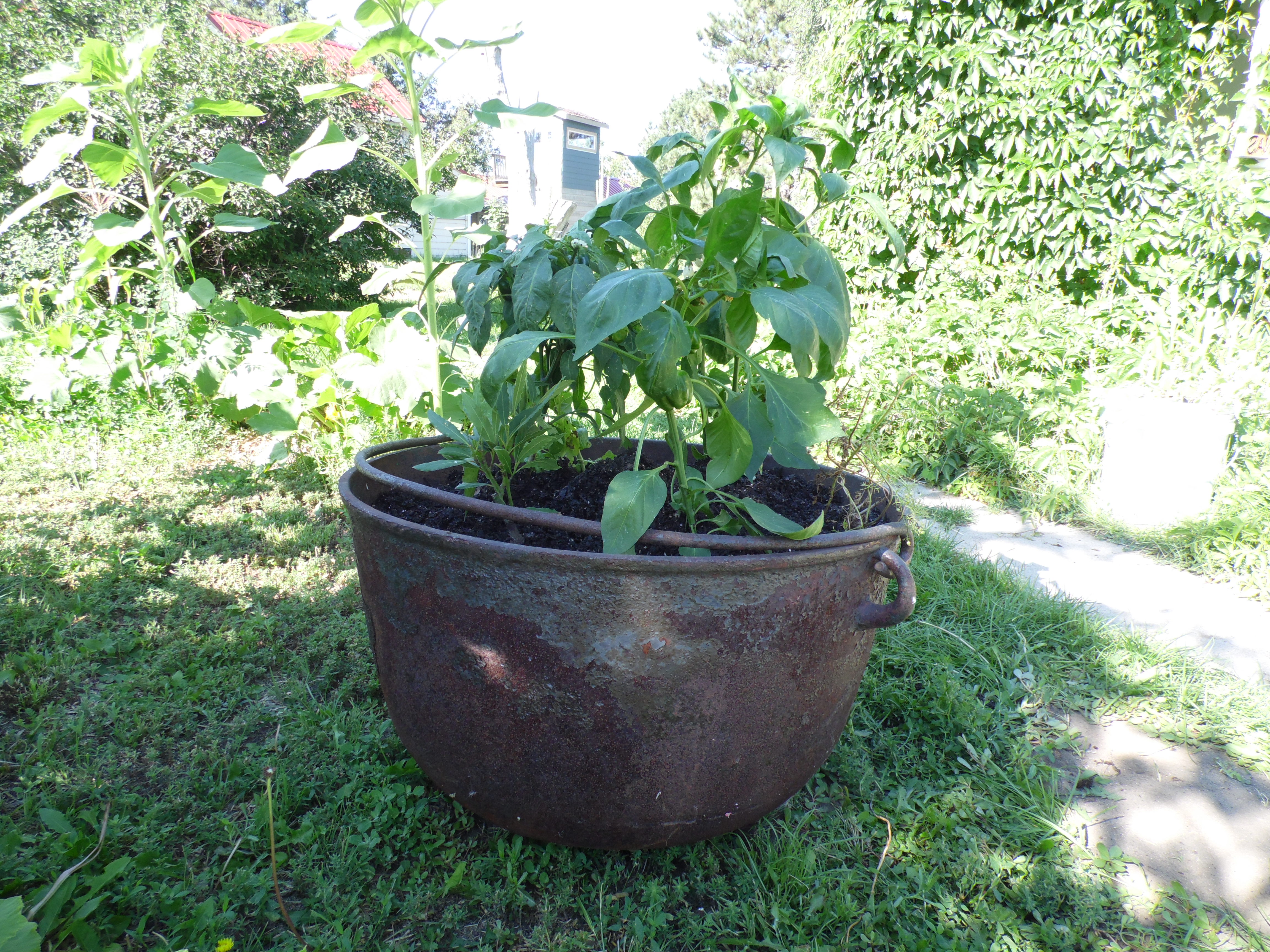 I decided to bring the cauldron out. I planted pepper plants and herbs in it. I always worried it would be too heavy to move once I planted in it. It takes two men to move it empty. It has holes in it already. It makes a great planter. Why not empty the soil out when it is time to move it? It is a great planter, I should have used it earlier!