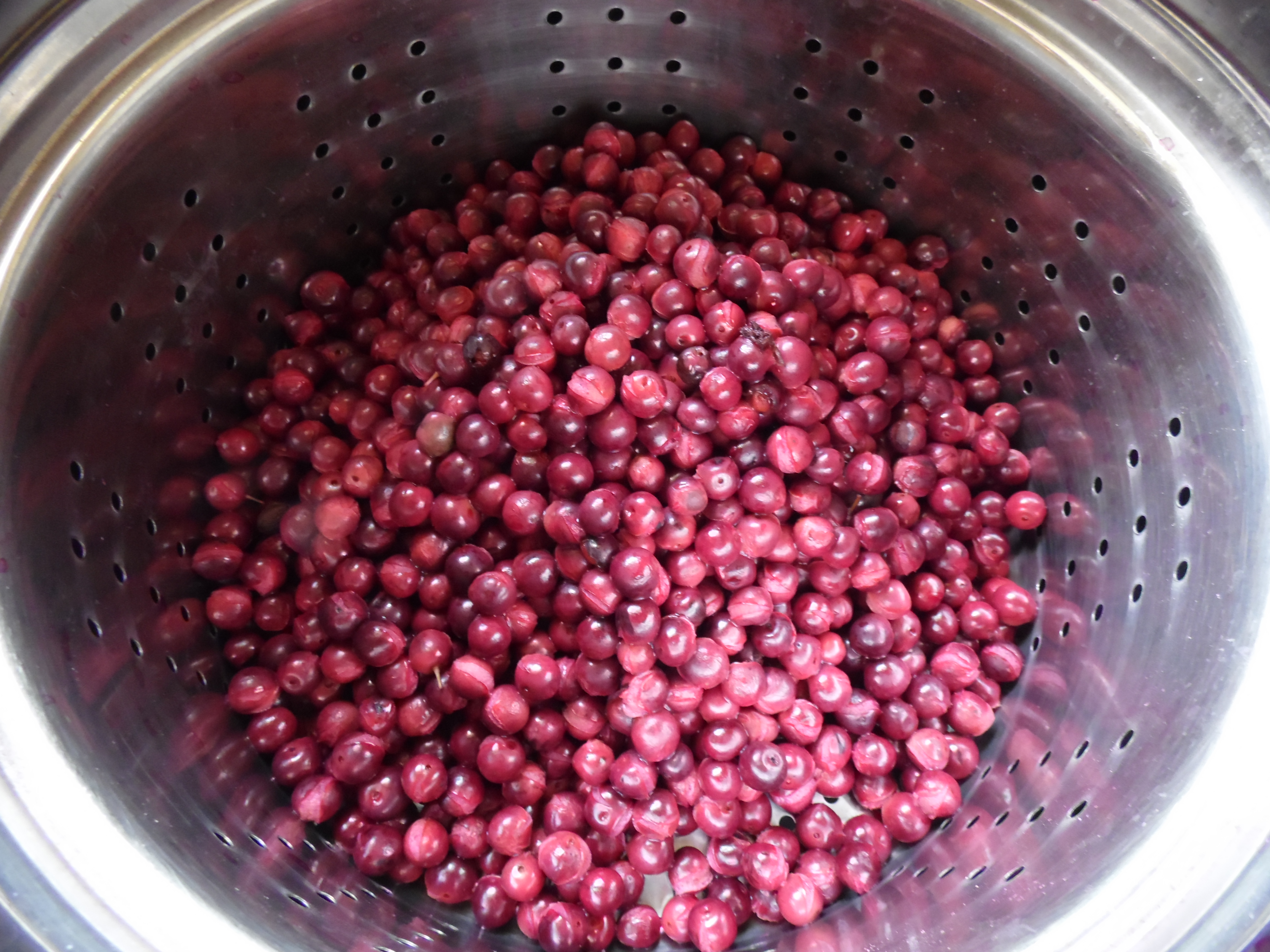 Place 1 quart of chokecherries in a saucepan and cover with about two inches of water. Boil until the color is lovely and the seeds are all showing through the skin. Strain liquid.