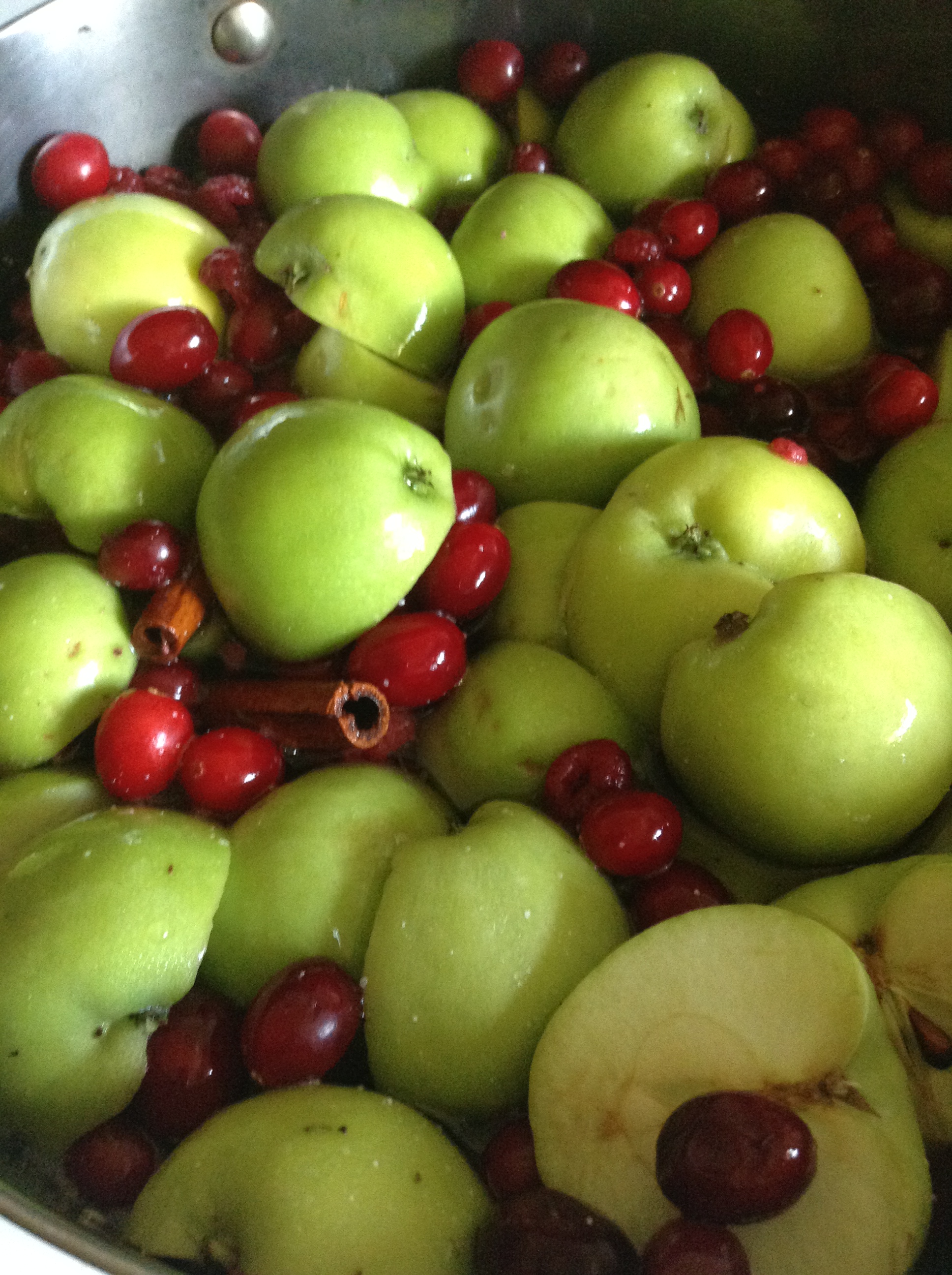 Load up a large pot 2/3 full of fruit. I sliced apples in half (I did not even bother to core them, I just made sure they didn’t have bugs in them!) and did one batch of just apple. The second batch I threw in the contents of the partial bags of frozen fruit in the freezer. Cranberries, raspberries, and a few strawberries joined the mix, adding their own festive color. A couple of cinnamon sticks and a cup of brown sugar for fun went in as well. Fill the pot to a few inches from the top with water and boil lightly for two hours. Pour into clean quart jars, wipe the rims off, replace the lids and place in a large pot with water covering the jars. Boil for 10 minutes. Add 1 minute per 1000 feet above sea level. I boiled for 17 minutes.