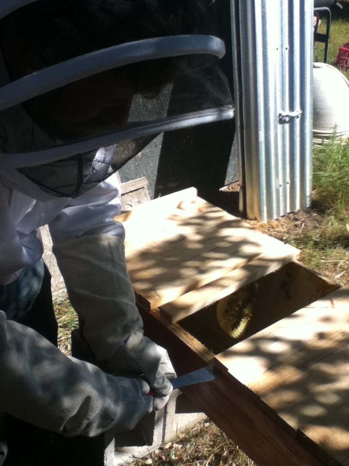 It started out with good intentions, Brett told us to go check the hive now that we had moved it.  Make sure the combs hadn’t fallen down, make sure the queen is alive, make sure…oh, I don’t remember what else.  They were busily working on their nineteenth frame.  Imagine that!  Such a good year for bees.  Originally we heard to save them ten frames to get through the winter but with the talk of an upcoming hard winter, fifteen became their larder.  Four for me.  Luckily, or not so luckily, one of the combs had indeed fallen down.  Doug went inside for a large pot and some tongs.  We realized how fragile the comb was as it continued to break into pieces which made it very difficult to get it into the pot, honey dripped everywhere, bees trapped in their own creation, the rest growing in increasing anger.  We moved the next frame and part of it broke off.  I panicked, sudden vision of all of the combs breaking under the force of our knife trying to see if everyone was alright and inevitably smothering the whole bunch.  We took out the frame we had just messed with, content to harvest two frames and leave the kingdom alone.  Not so easy.