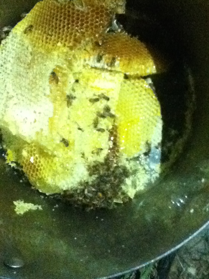 The entire outside of the frame was sticky and a hundred or so bees would not let go of the comb.  Meanwhile in the pot where the four pieces of comb and honey lay, another several dozen bees tried desperately to get the honey back out.  As we placed the other comb on top (or threw it, I can’t remember, the bees were really mad at us at this point) the bees on the bottom layer melted into the honey and buzzed to their death.  The bees would not leave the pot.  In the middle of the night we went out and tried to scoop them out, they fell here and there, died in their sticky grave, huddled together in a swarm.  They were not giving me one ounce of honey.  I had not read about any of this.  Books make things look so seamless.