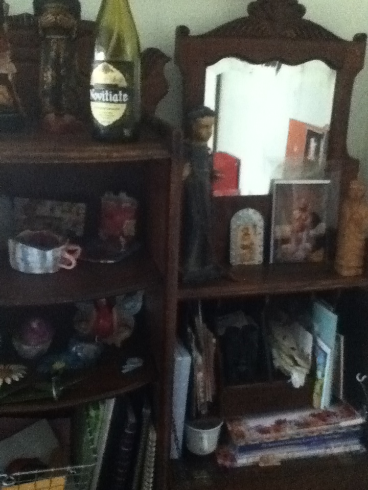 My writing corner is also in this room.  The old secretary was at a garage sale near my grandparents’ house for a mere sixty dollars!  My favorite painting sets the scene of contemplation and writing.  The saints look on.  The various ceramics were made by my children throughout their childhood.  Sweet mementos.  Stationary, cards, envelopes, writings, magazine cutouts, pads of paper, pens, everything one needs to write and create.