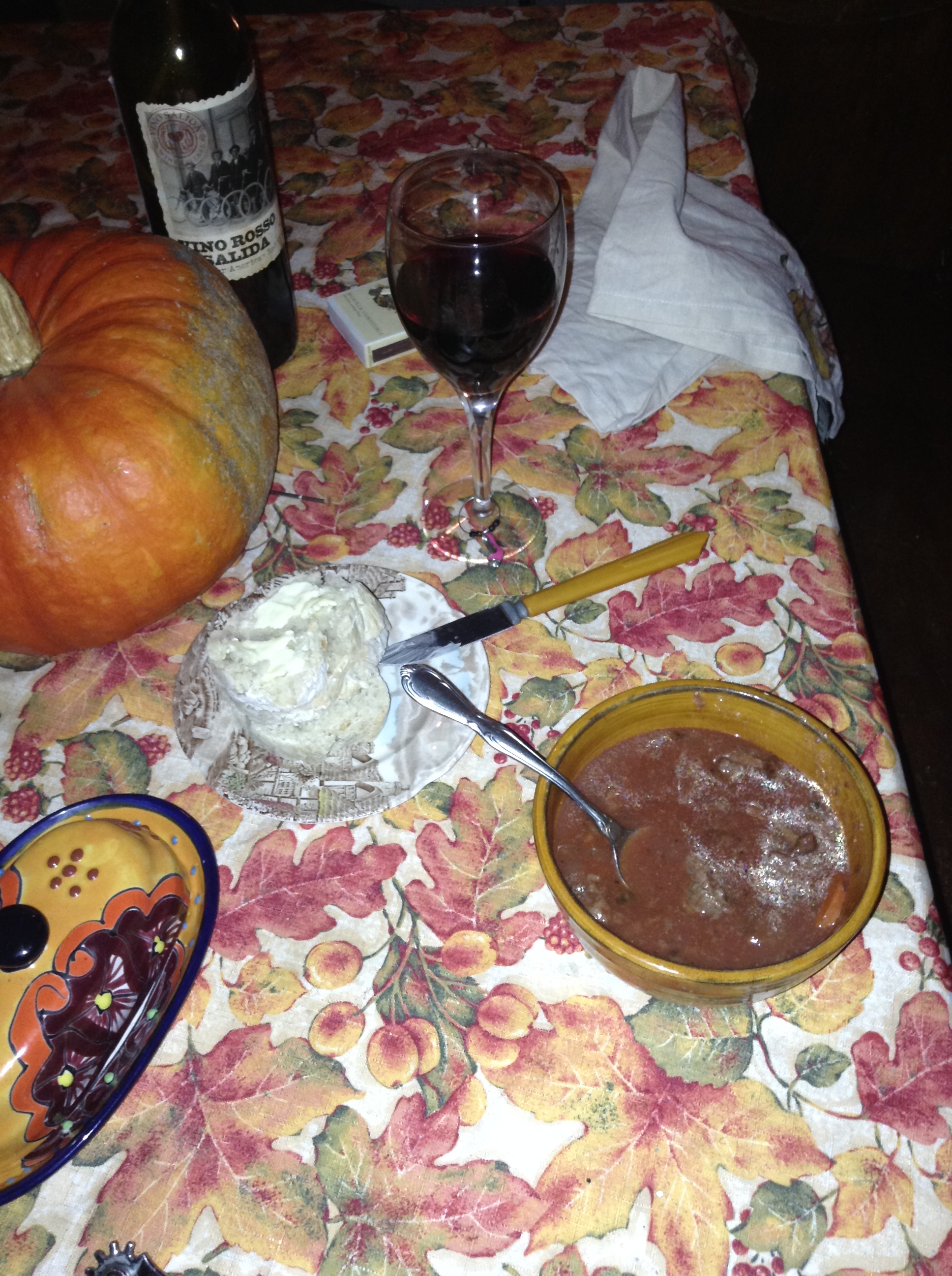 I was anxious to make the Julia Child classic Beef Bourguignon. After years and years of making the recipe with veggie meat, I was ready to make the real deal with sirloin I had purchased from my friends, Margaret and Krista. Krista actually goes and visits with her cows every day. They are well loved and well fed animals. I looked over the recipe from Julia Child and one from Ina Garten. I did not have all the ingredients. The nearest store is thirty minutes away and budget is tight right now (we need to get wood!) so I streamlined the recipe to what I had and it turned out mouthwateringly good. You don’t have to follow recipes exactly. You can add or subtract what you like and don’t like. Add more of something. Be creative. I didn’t have any bacon, but I bet that would be great in the stew. I didn’t want to put in all that onion. I had dried mushrooms. It all worked out. And I had a happy, well fed homesteading hubby. A glass of rich, red wine goes beautifully with this dish. Also add a loaf of homemade bread.