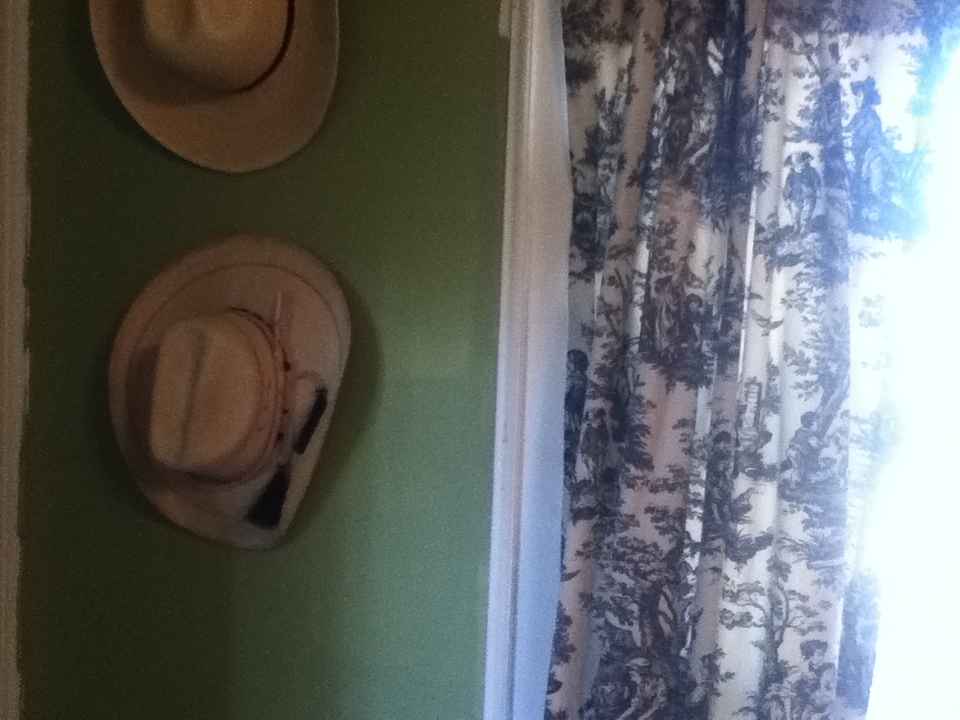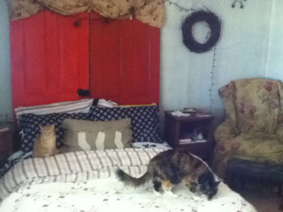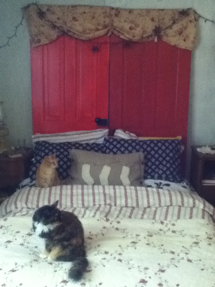 Now anything I wanted to bring to this house had to have a use.  Downsizing from 2500 square feet (including garage and basement) to 850 square feet (along with a small space to store luggage and canning jars in the greenhouse) meant that I could not pack everything.  The blue door was a gift from Doug for Christmas.  I love it.  The door to the guest room was hanging off of one hinge and we replaced it with a screen door.  I had two old doors that wanted to be displayed.  By making them into a headboard, they look as if we could walk through to a magical place, if only in dream.