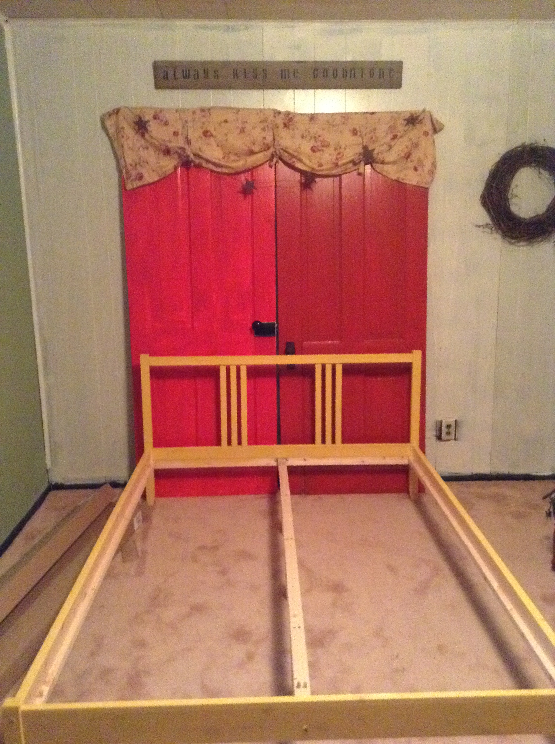 The doors were different sizes so I attached a valance with a pattern I love to the top to cover the edges.  A string of metal stars and a sign that reads, “Always kiss me goodnight” sets the scene for sweet dreams.